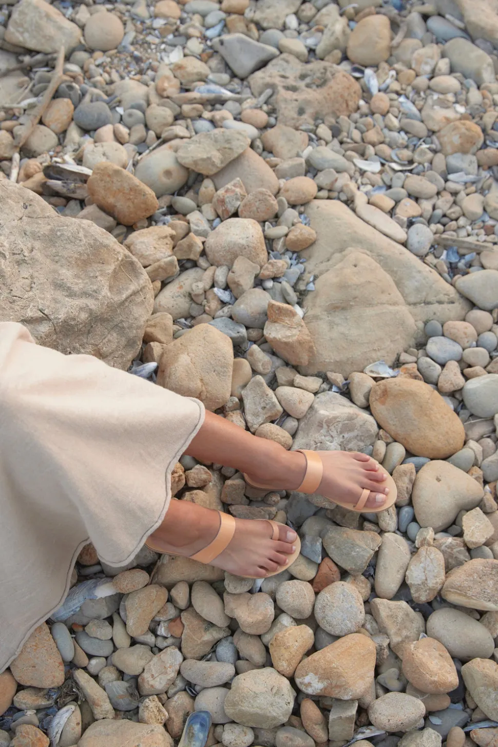 100% natural chemical free leather. Features a rubber sole. Handmade in Greece.