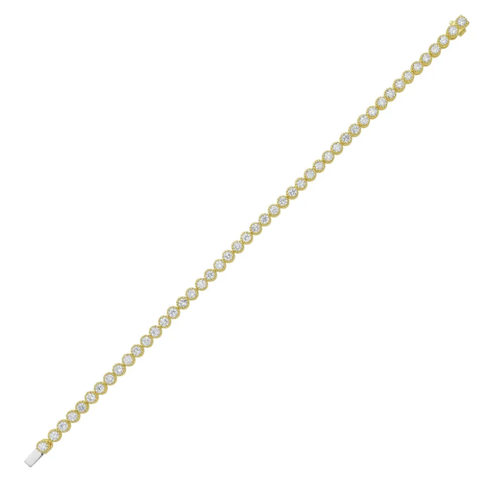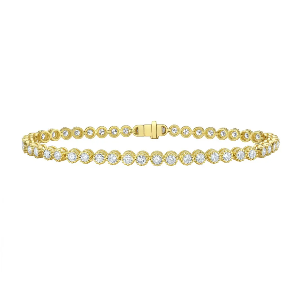 Luxury jewelry house, RUCHI New York, specializes in creating unique and versatile pieces that are exquisitely handmade and boast an heirloom quality. Crafted with precision in a variety of metals, each piece by this brand is designed to be cherished as a symbol of enduring love, whether it’s a stunning diamond ring or a timeless necklace. The Thistle Diamond Yellow Gold Tennis Bracelet features round diamonds set in a distinctive milgrain bezel—a refined twist on a beloved classic, ideal for stacking or elevating everyday style.