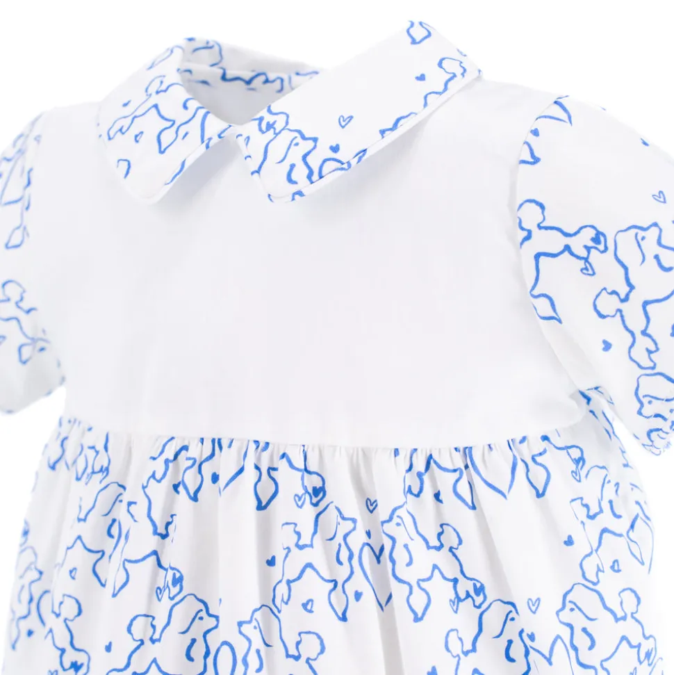 96% cotton, 4% spandex. Crafted from Colombian fabric. Features a Peter Pan collar. Heart applique on chest. Blue piping on collar and sleeves.