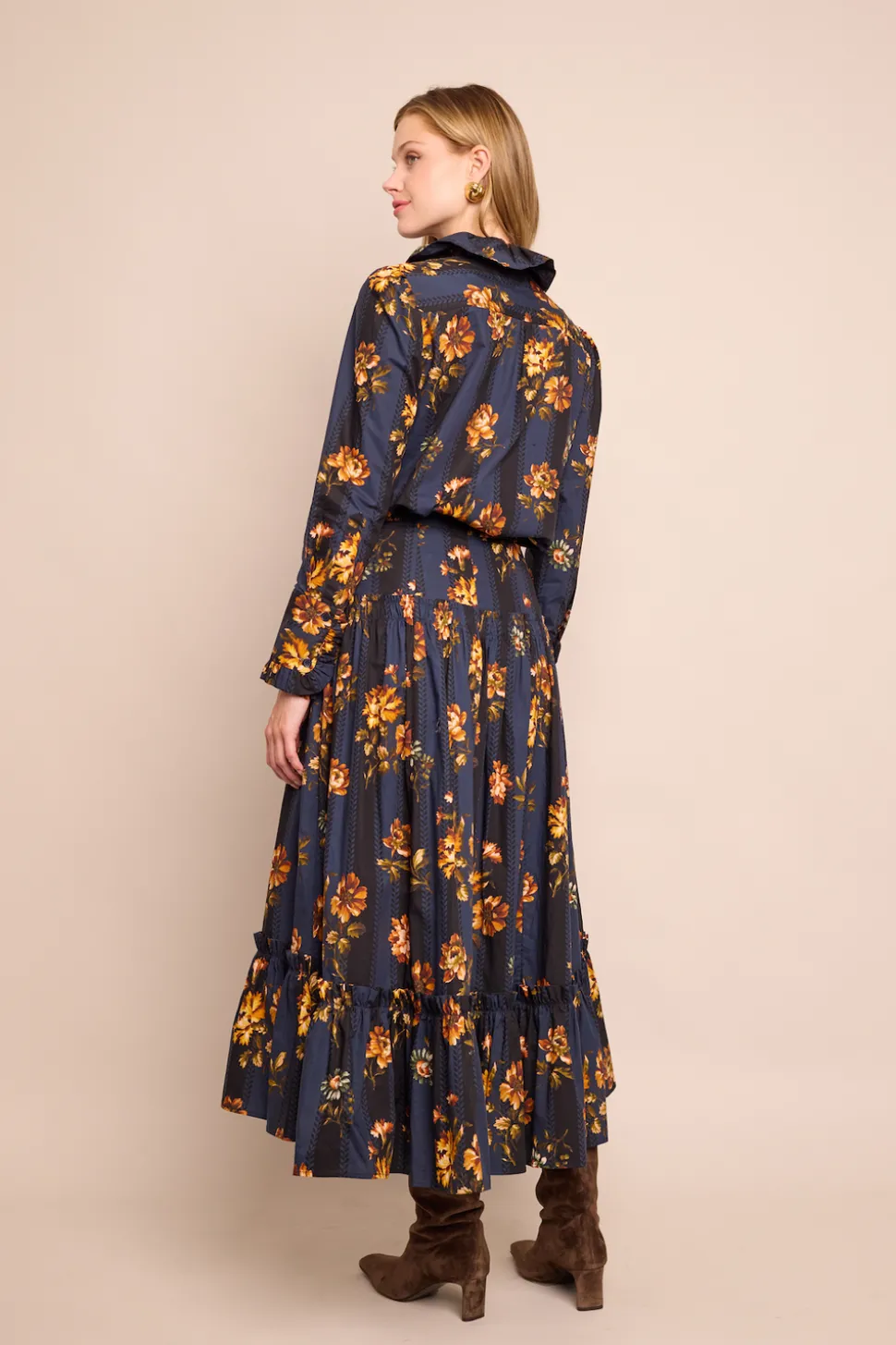 Founded by three New York City-based mothers who met through their kids, Cara Cara’s hallmarks include crisp poplin, house-designed prints, and casual glamour. The inspiration for their ethical womenswear comes from interior design, as well as the world’s most exotic locales. The Tisbury Skirt in Amour Flora Navy balances a bohemian spirit with a polished fit. Its high-low, tiered ruffle design offers just enough volume to feel special while remaining casual enough to pair with a knotted tee for a playful look. The A-line silhouette features a wide yoke at the high-rise waist and a concealed back zip fastening, all rendered in a striped floral print.