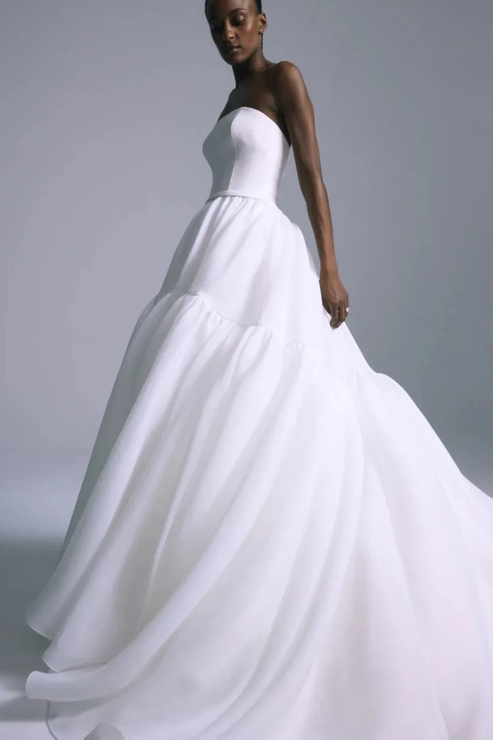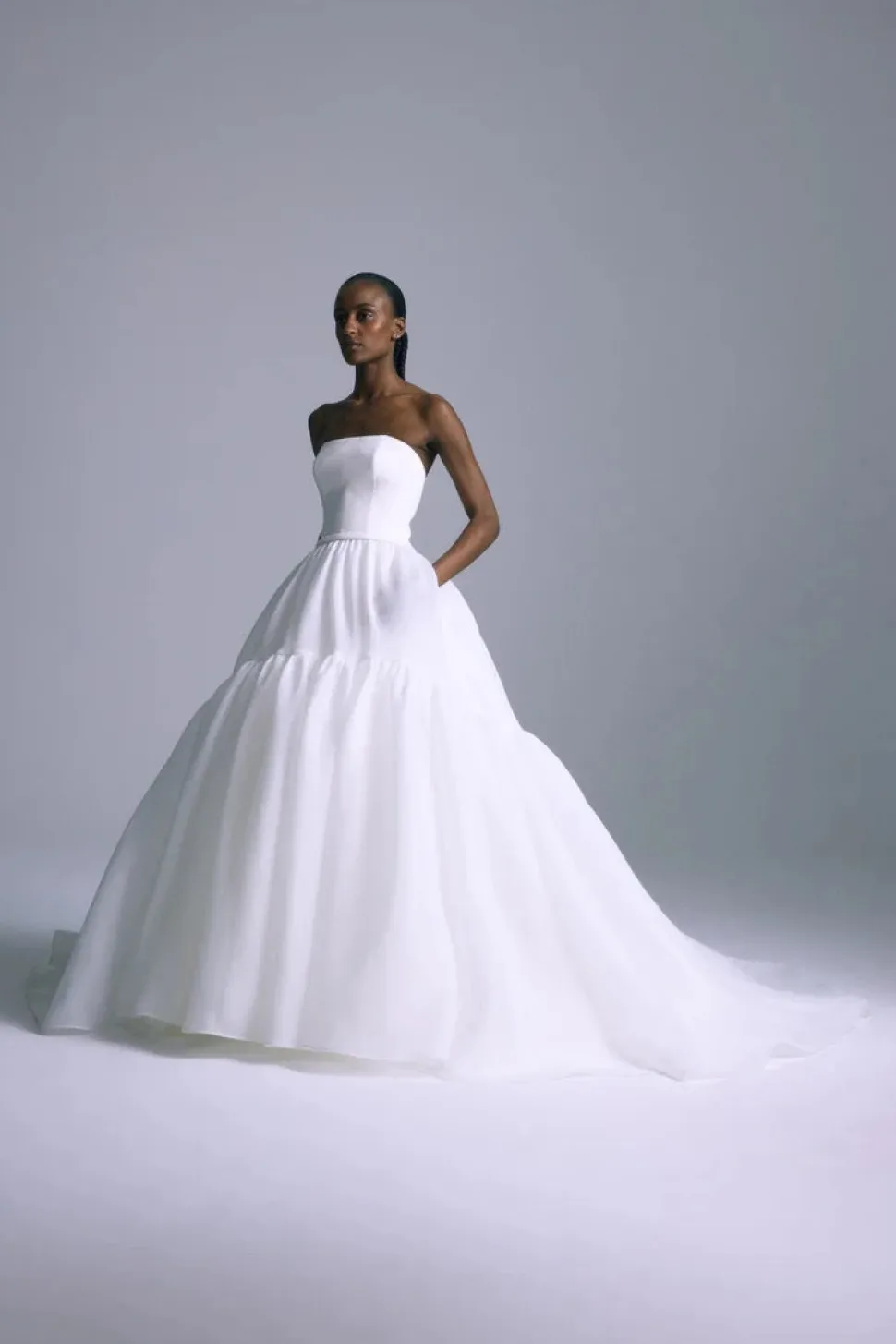 Over three decades ago, Ethiopian-born Amsale Aberra began crafting modern, personalized wedding dresses, beginning with her own. Today, her distinct bridal gowns—handmade with couture techniques in AMSALE’s New York City atelier—share their tasteful femininity, unstated glamour and attention to detail with sophisticated women the world over. The Toby Drop Waist Gown is a gazar strapless drop waist gown with a double tiered gathered skirt. Pockets in skirt.