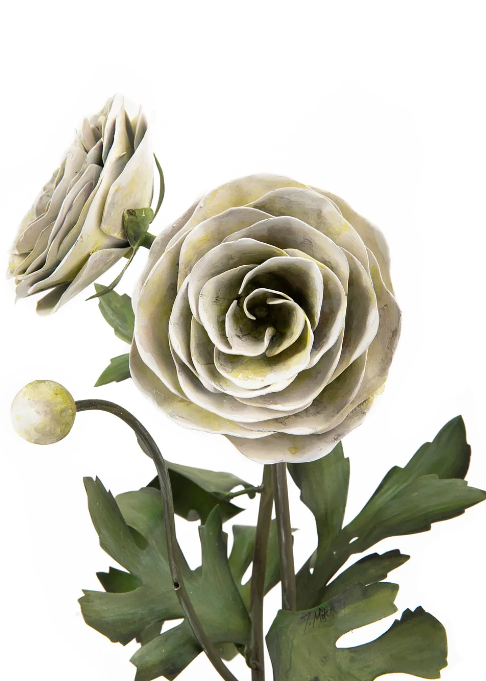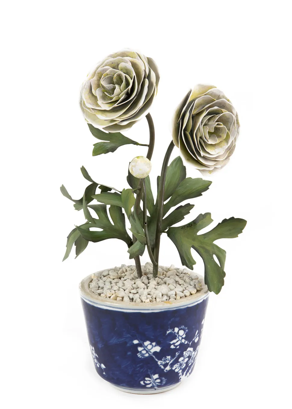 A former art restorer, Tommy Mitchell began creating his line of floral-inspired art installations for private clients, which led to his line of homewares. Working with a combination of copper, steel, paint, and gold leaf, and a dedicated team of artisans from his North Carolina studio, his hand-made, signed works are renowned for their artistic quality and singular beauty. Painted natural or gilded or zinc, and exulting the charm, attractiveness, and sensuality of its namesake flora, the Tole Flower Potted Ranuculas provides artistic dimension and natural flavor to any space it graces.