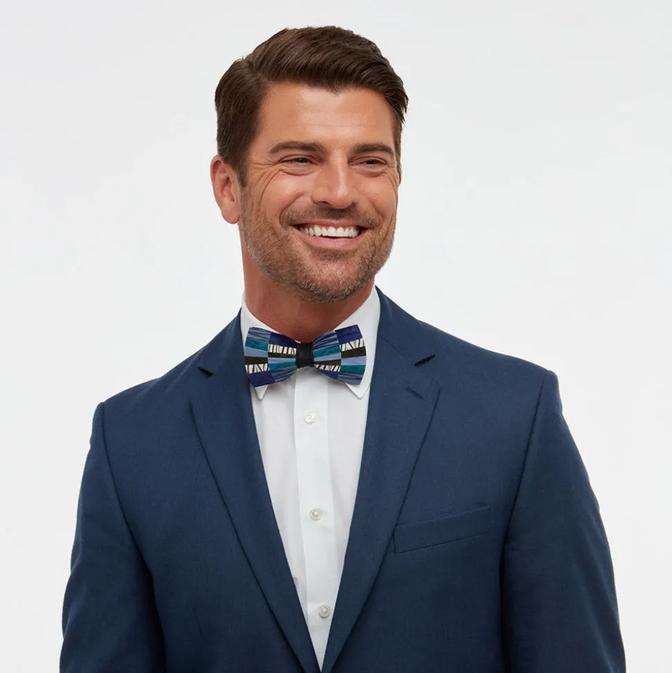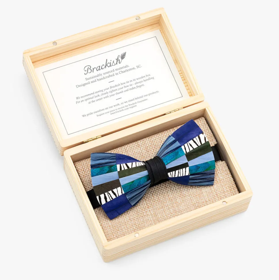 Brackish began with one feather bow tie designed by Ben Ross and gifted to his groomsman, Jeff Plotner. Since its inception, the brand has blossomed into a full line of men’s and women’s accessories designed and handcrafted in Charleston, South Carolina with each piece focused on honoring the beauty found in nature. The Tombstone Bow Tie is meticulously hand-laid, creating an intricate patchwork pattern in rich blues with pops of white showcasing the art of fashion in a detailed and elegant design.