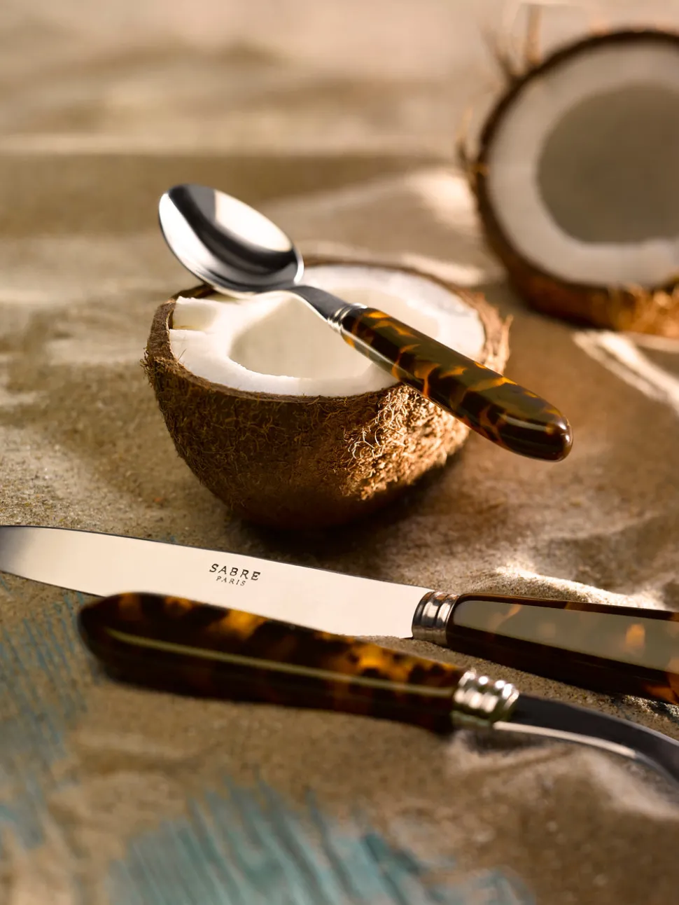 The Sabre Tortoise Place Setting is a flashback to the ’50s with sepia tones and a tortoiseshell design. This 5-piece set includes a dinner knife, dinner fork, soup spoon, salad fork, and teaspoon.