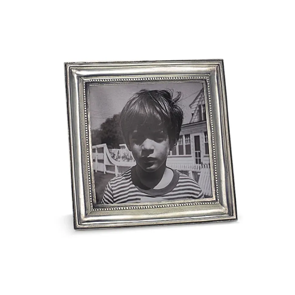 The Toscana Square Frame is a beveled Italian pewter picture frame embellished with an inner border of luxe square beads. A must-have for the ultimate hostess, MATCH pewter—a valuable metal composed of tin, copper, and antimony—is handmade by artisans in Northern Italy. Its classic look complements both traditional and modern place settings and recalls decadent celebrations. Its classic forms harmonize with both traditional and modern settings. Its warm reflections recall celebrations at well-laid tables and storytelling by candelight. Each piece is made with an alloy that is food safe lead-free, FDA approved and requires very little care. Every piece of Match pewter is marked with the manufacturer’s “M” hallmark as well the mark of tin content “95.”