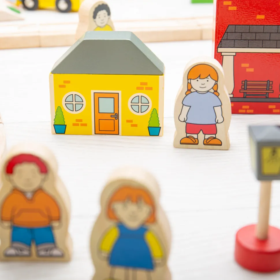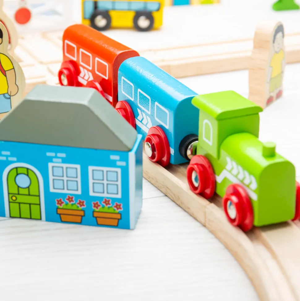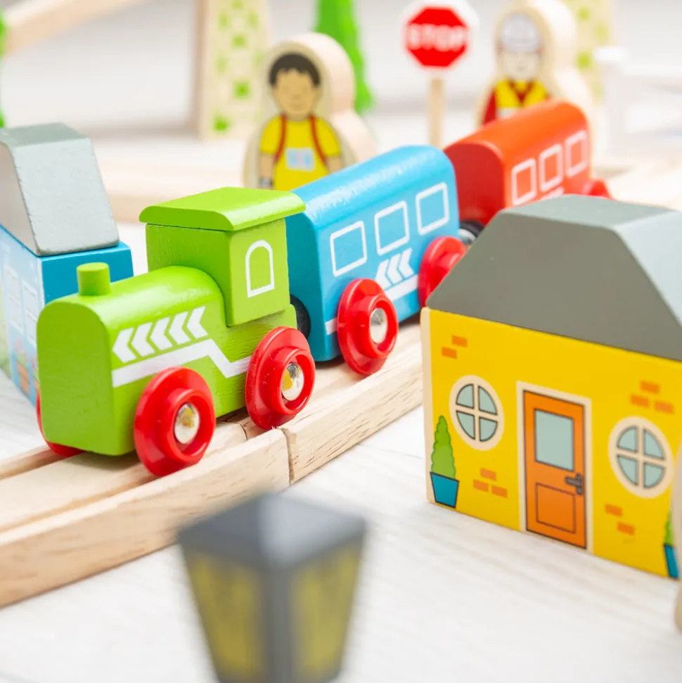 Quality has always been at the heart of Bigjigs Toys, a family business that began in 1985 with puzzles crafted from a garden shed in Kent, England. Today the company boasts a wide range of toys and games that are not only safe, and made to last, but complement childhood development through fun, exploration and learning. Enjoy the buzz of the town and the peace of the countryside with the Town and Country Wooden Train Set. Bright young minds can enjoy the best of both worlds with this colorful and fun train set. From the town station, take a ride to the country store; chug through the woodland and out to the river before returning home again. Wooden houses, cars, town and country folk plus a level crossing and a boat will keep little ones entertained with endless wooden railway play scenarios. Consists of 91 play pieces. Additional wooden train set accessories are available to expand this set. Most other major wooden railway brands are compatible with Bigjigs Rail. Made from high quality, responsibly sourced materials.
