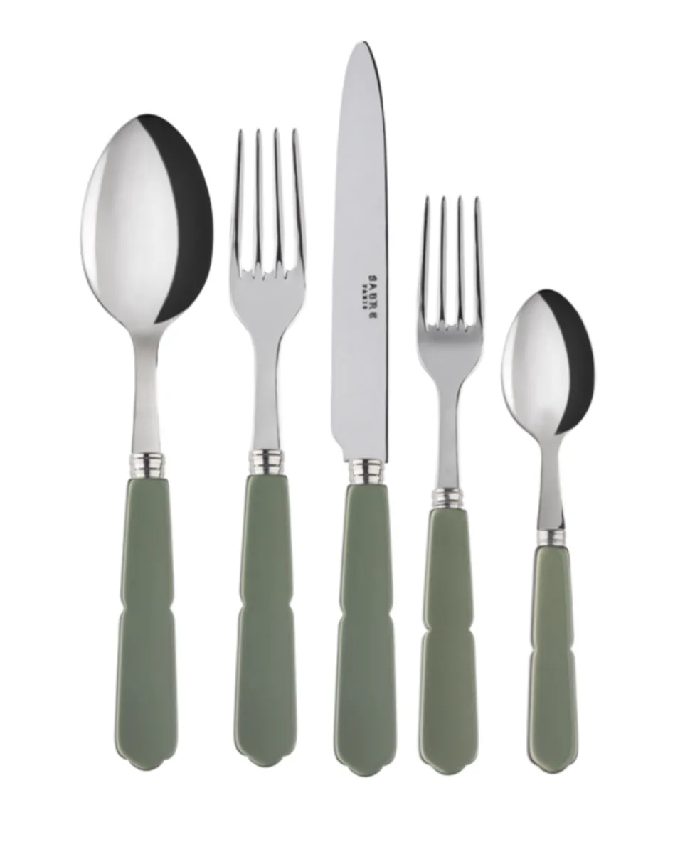 Inspired by old-style traditions, this Sabre flatware collection is a classic addition to any table. Pair with pared-down dinnerware or combine with bold china, the dark green cutlery complements all. This 5-piece set includes a dinner knife, dinner fork, soup spoon, salad fork, and teaspoon.