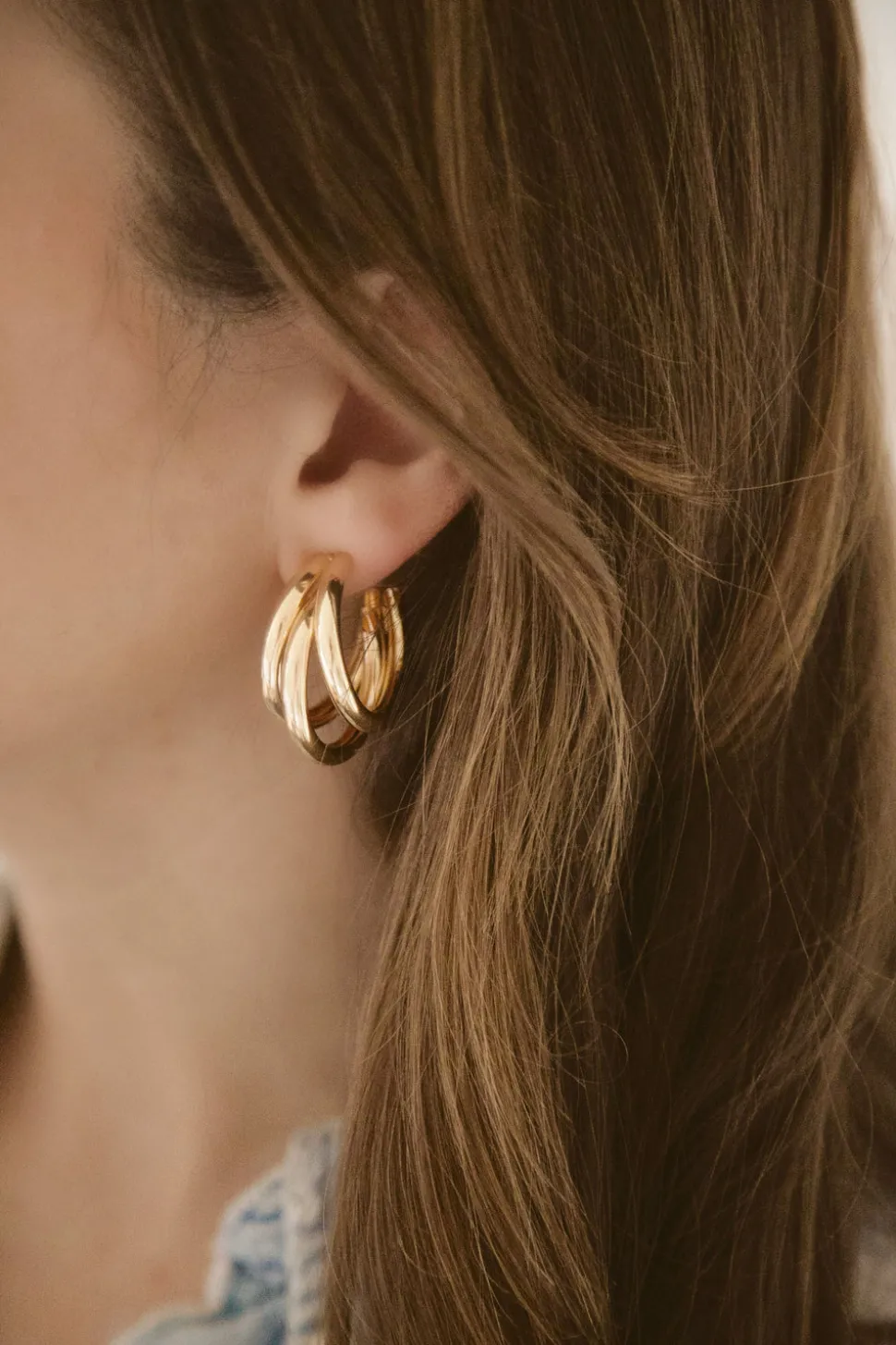 24K gold-plated triple hoops on stainless steel hypoallergenic posts. Featherweight.
