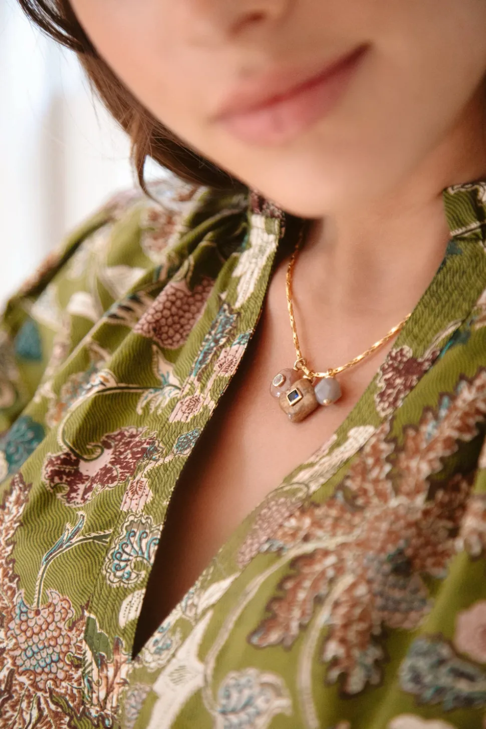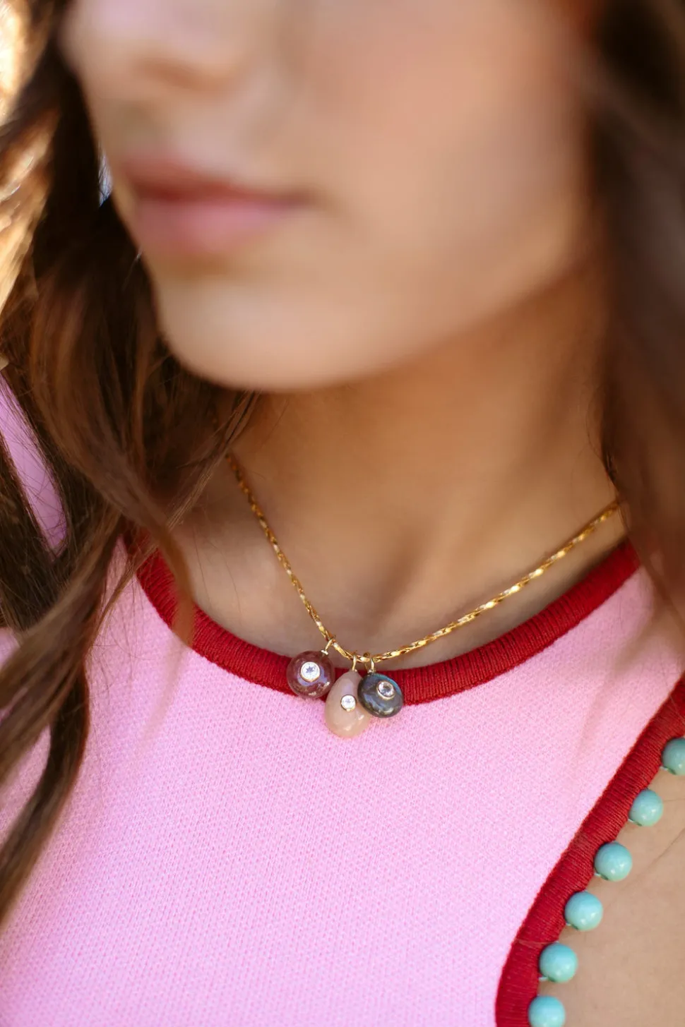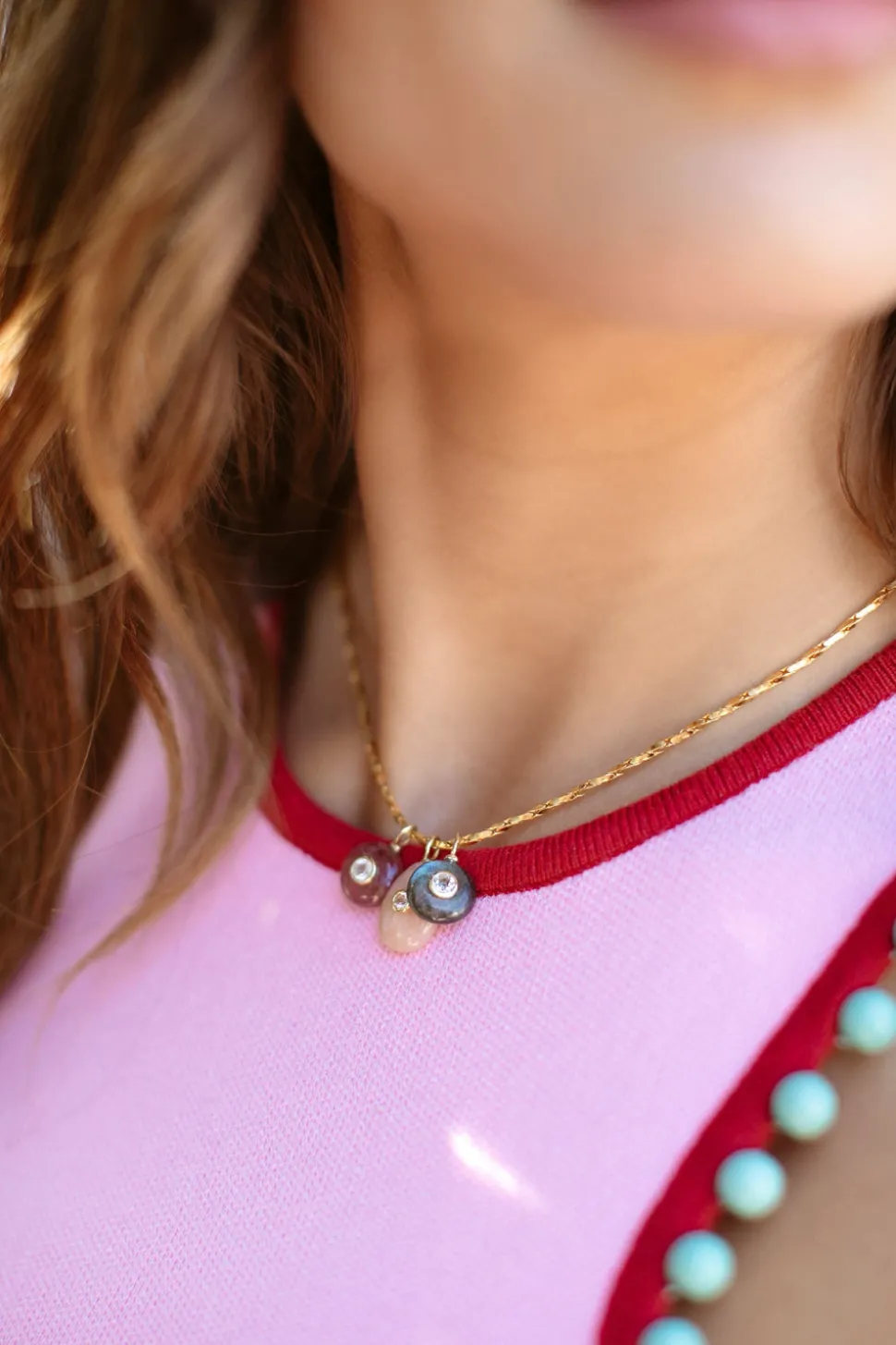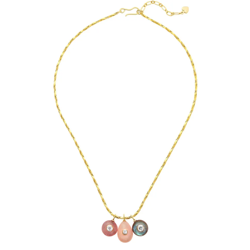 The mother-daughter duo behind Brinker + Eliza combine their experience in metalsmithing and fashion to create incredibly unique jewelry that feels custom-made. Employing pearls, shells, and earth’s most prized organic forms, these are pieces to be not just worn but treasured. The Tripp Necklace features three semi-precious gemstone charms with crystal inlay, sliding along a twisted gold chain for a playful, charm-forward statement.