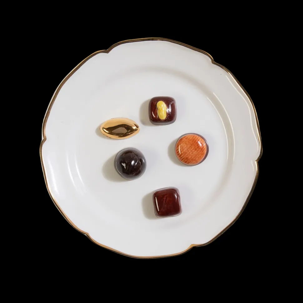 Zoë de Givenchy’s French-made ceramics, linen, and flatware display refinement above all else. This, and a certain je ne sais quoi, were gleaned from the table of her husband’s uncle, Hubert de Givenchy, the legendary couturier, and one of the century’s finest hosts. This special edition Trompe l’œil Chocolat Decorative Plate is hand formed and painted in gold leaf. Do not be deceived by its masterful design—the artistic technique of “Trompe l’œil” creates the illusion of five delectable treats temptingly arranged on the plate.