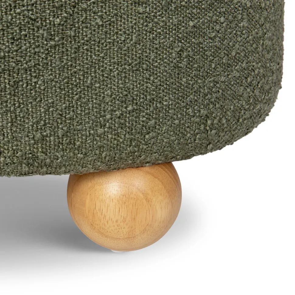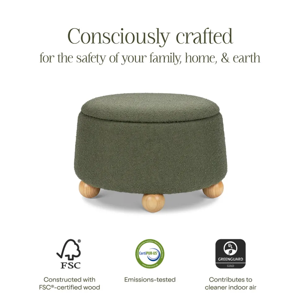 Made to treasure, Namesake brings quiet sophistication to the nursery and beyond. Imbuing heirloom-quality craftsmanship with modern sensibility, these timeless essentials are made to be cherished for years to come. The Tuffet Storage Ottoman in Performance Olive Bouclé with Honey Ball Feet blends plush texture with purposeful design. Its rounded silhouette, soft upholstery, and sculptural wooden ball feet offer a refined accent, while the hidden storage compartment adds everyday ease.