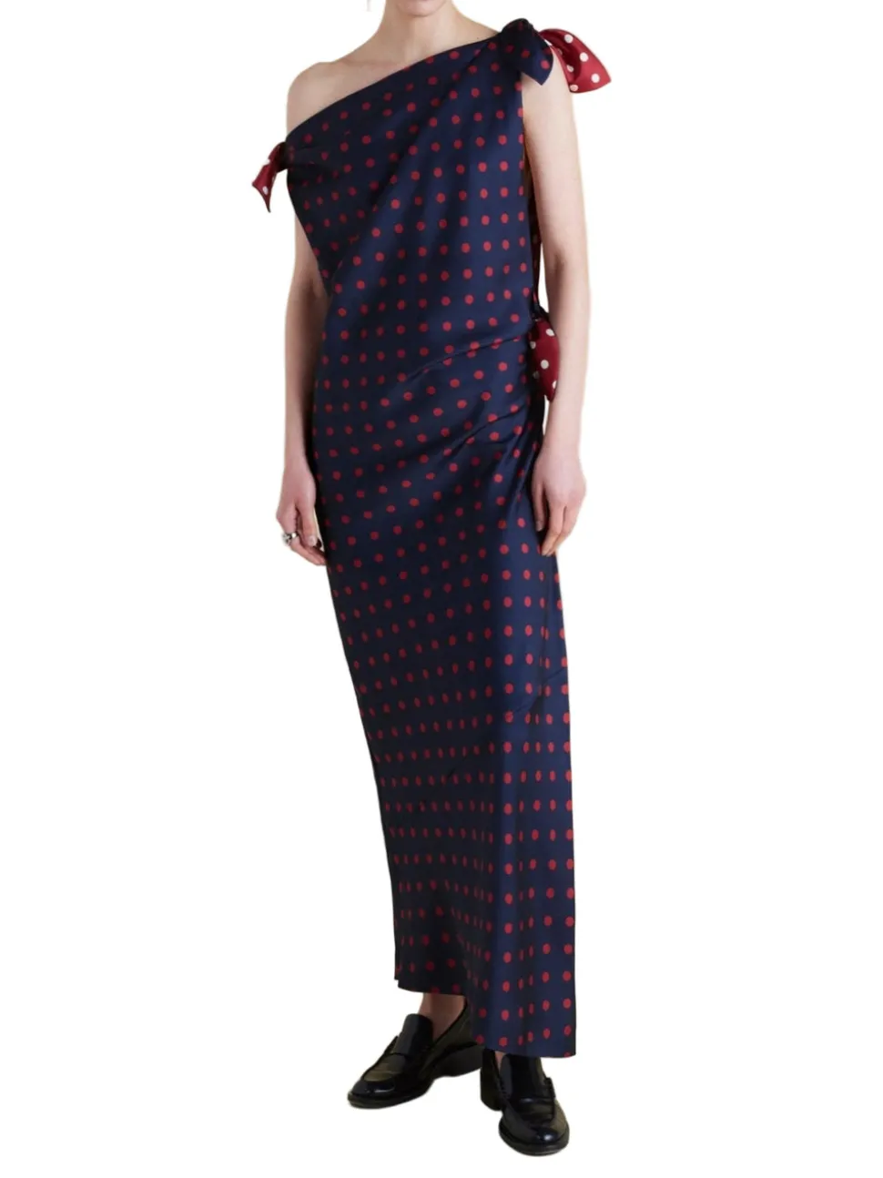 Founded in 2016 by sisters Marina and Francesca Moscone, the label gravitates toward a tactile approach, twisting and draping fabrics by hand to create a softly seductive design using custom jacquards, fil-coupés, and silk wools, all exclusively developed in Italy, rendered in precise shapes and tailoring. The Twill Polka Dot Tabard Tie Dress in Navy & Maroon reflects this artistry with an asymmetrical neckline, shoulder tie detail, and a bias cut that drapes fluidly without clinging. A contrast maroon and ivory lining underscores the brand’s refined attention to detail.