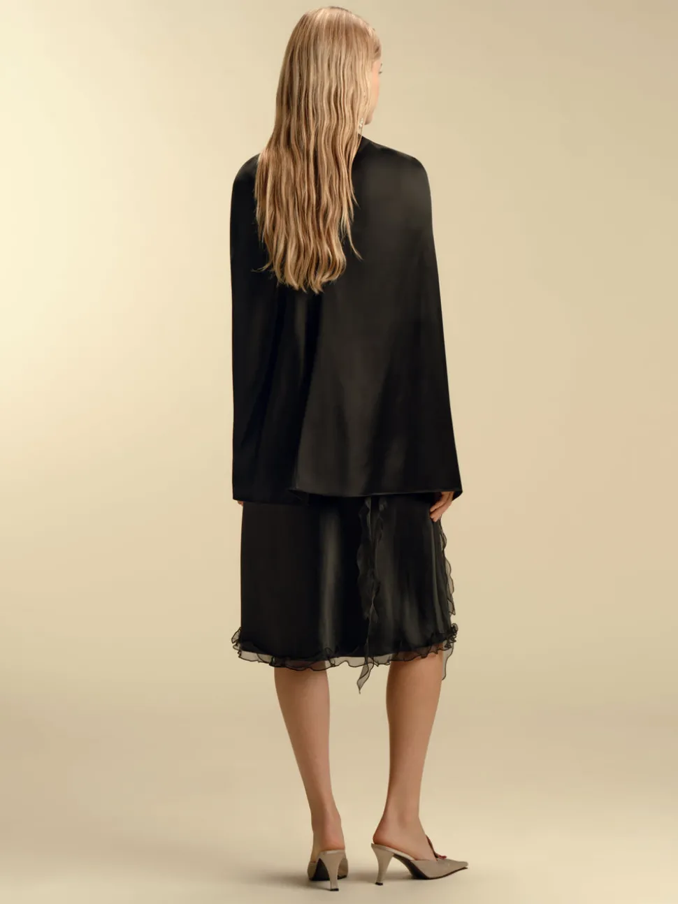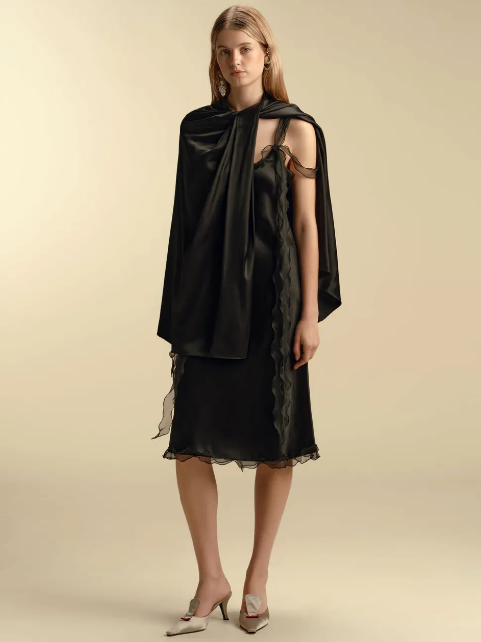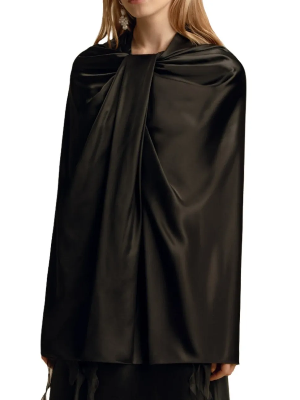 Founded in 2016 by sisters Marina and Francesca Moscone, the label gravitates toward a tactile approach, twisting and draping fabrics by hand to create a softly seductive design using custom jacquards, fil-coupés, and silk wools, all exclusively developed in Italy, rendered in precise shapes and tailoring. The Marina Moscone signature of lushly draped hand twisting defines the Twisted Capelet. The smart wardrobe accessory is luxuriously effortless when worn with a tailored blazer as with a slip dress alike.