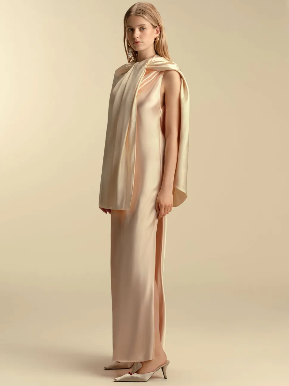 Founded in 2016 by sisters Marina and Francesca Moscone, the label gravitates toward a tactile approach, twisting and draping fabrics by hand to create a softly seductive design using custom jacquards, fil-coupés, and silk wools, all exclusively developed in Italy, rendered in precise shapes and tailoring. The Marina Moscone signature of lushly draped hand twisting defines the Twisted Capelet. The smart wardrobe accessory is luxuriously effortless when worn with a tailored blazer as with a slip dress alike.