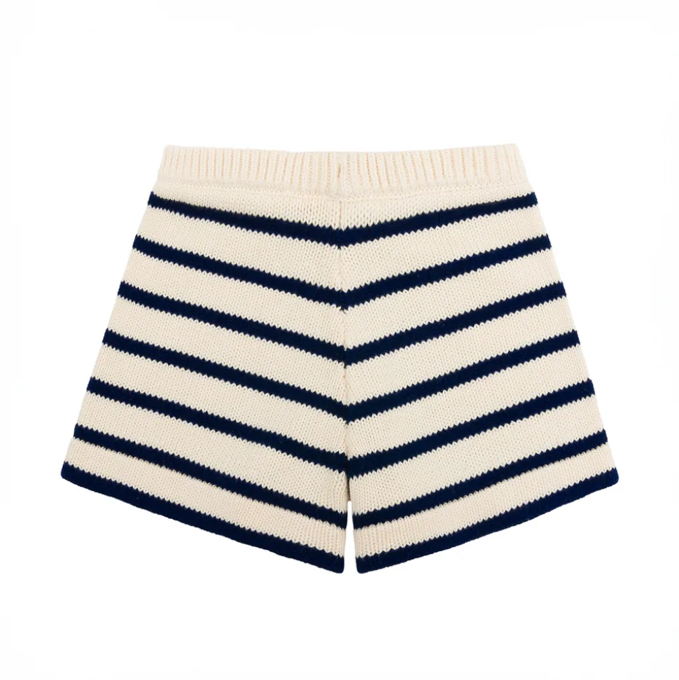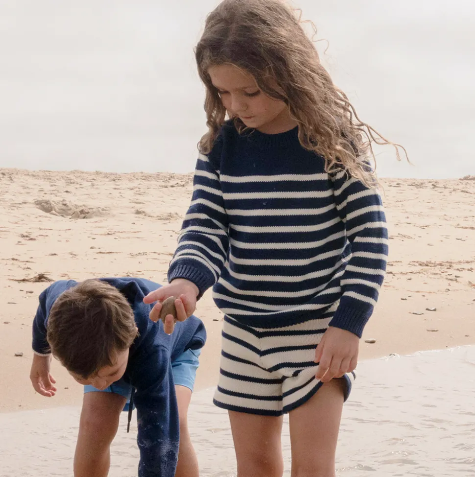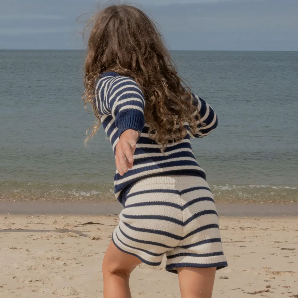 A family favorite for its clean lines and simple details, minnow creates pieces that are playful, polished, and thoughtfully designed for long days, sandy toes, and the wonderment of life on the shore. The Unisex Breton Stripe Knit Short is a cozy and ultra-soft premium knit essential designed for year-round wear. Featuring unique rib detailing throughout, this pull-on silhouette offers effortless style and comfort. Pair with the coordinating knit sweater for a sweet lounge set that will be a favorite for seasons to come.