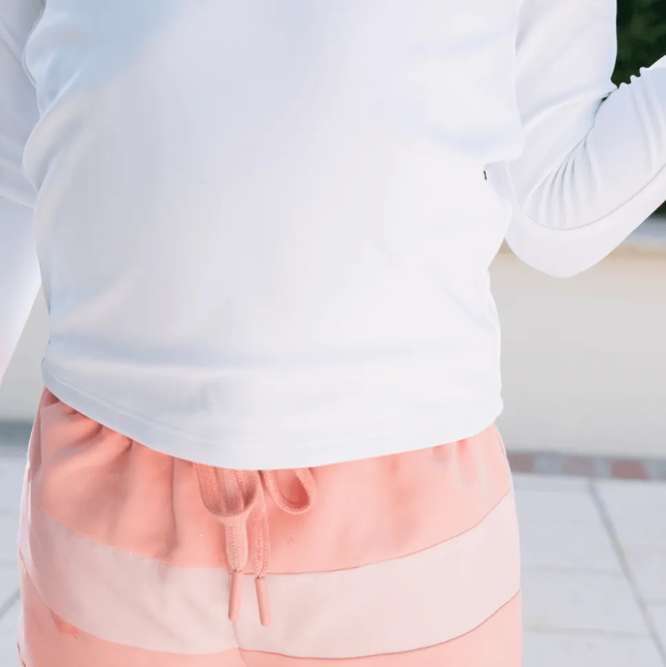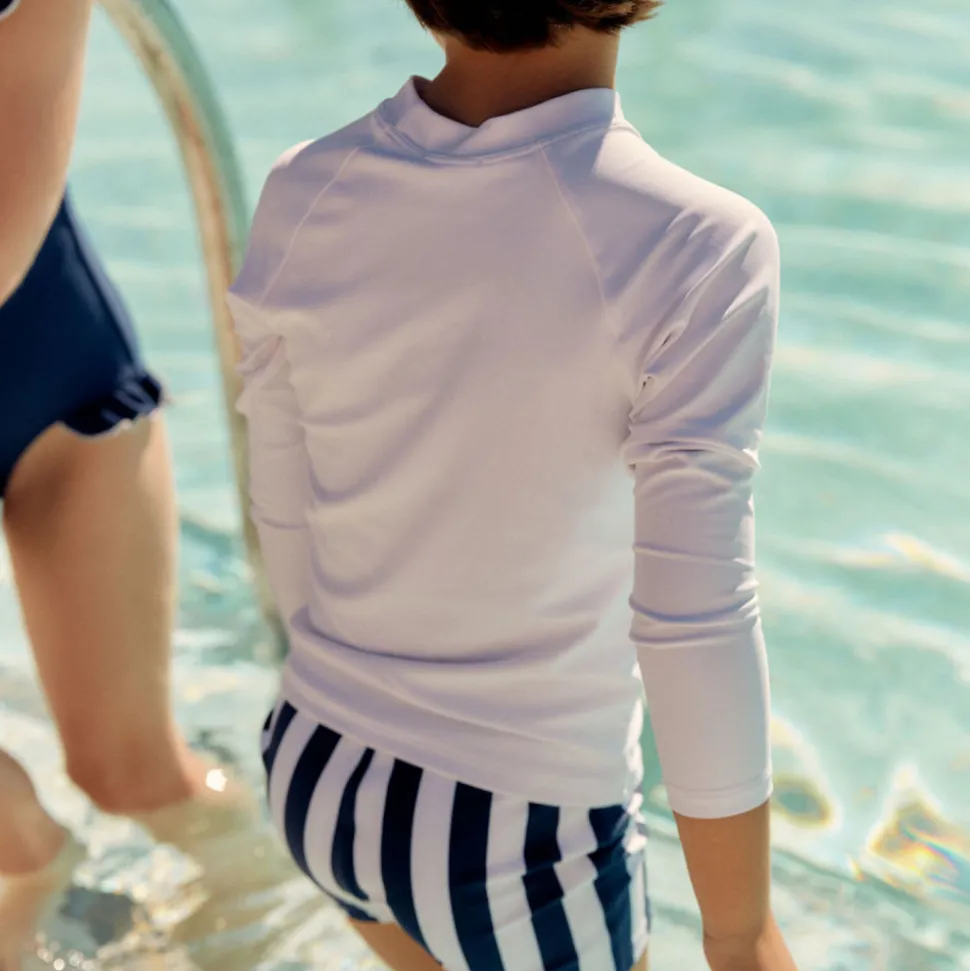 A family favorite for its clean lines and simple details, minnow creates pieces that are playful, polished, and thoughtfully designed for long days, sandy toes, and the wonderment of life on the shore. Featuring long sleeves for more sun-safe coverage, the Unisex Crane White Rashguard has snap buttons for easy access and is crafted in a buttery soft fabric that’s fully lined, except for the sleeves, allowing for both movement and breathability.