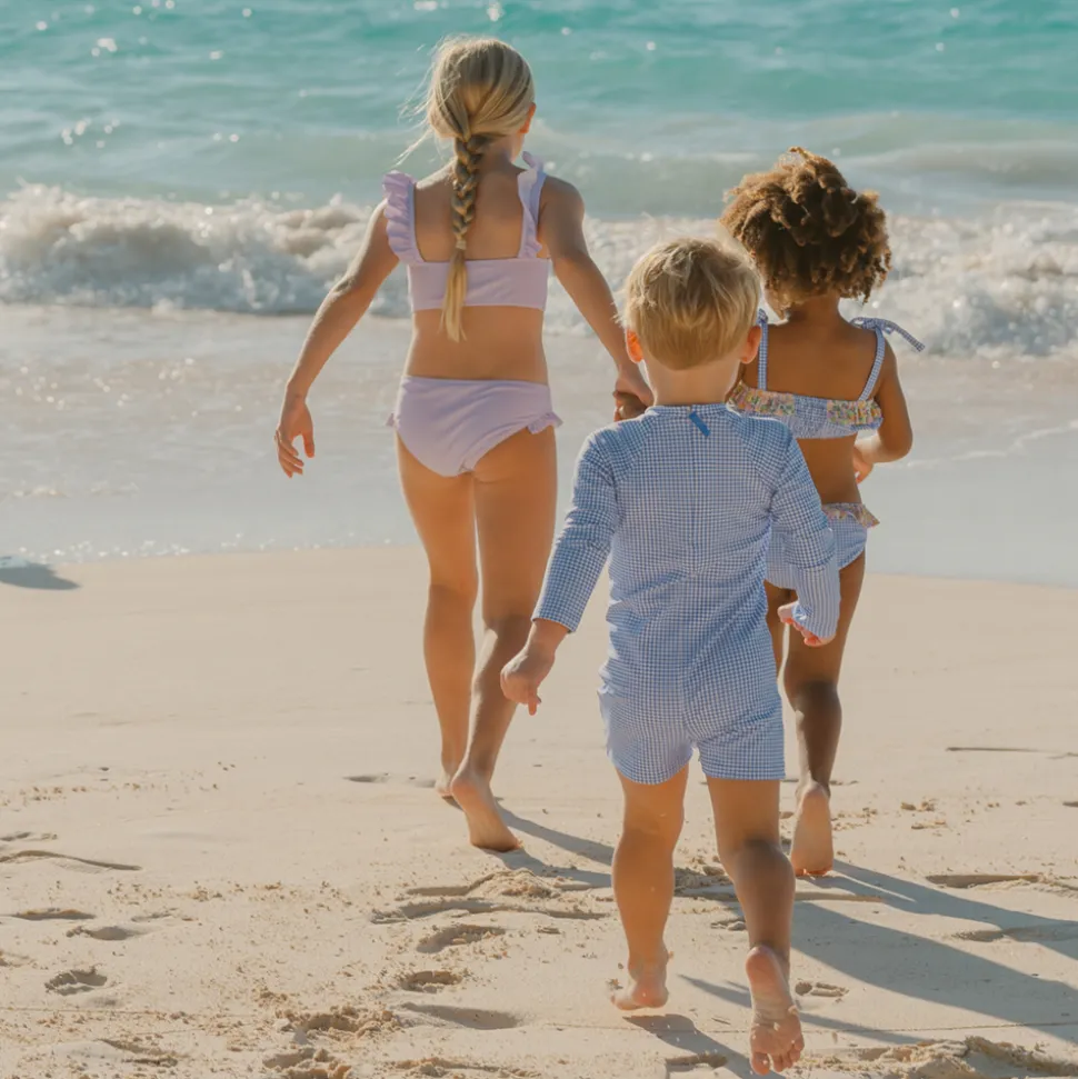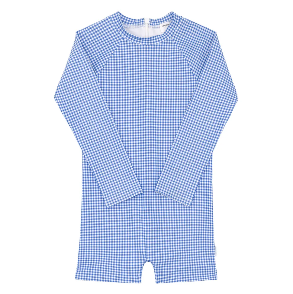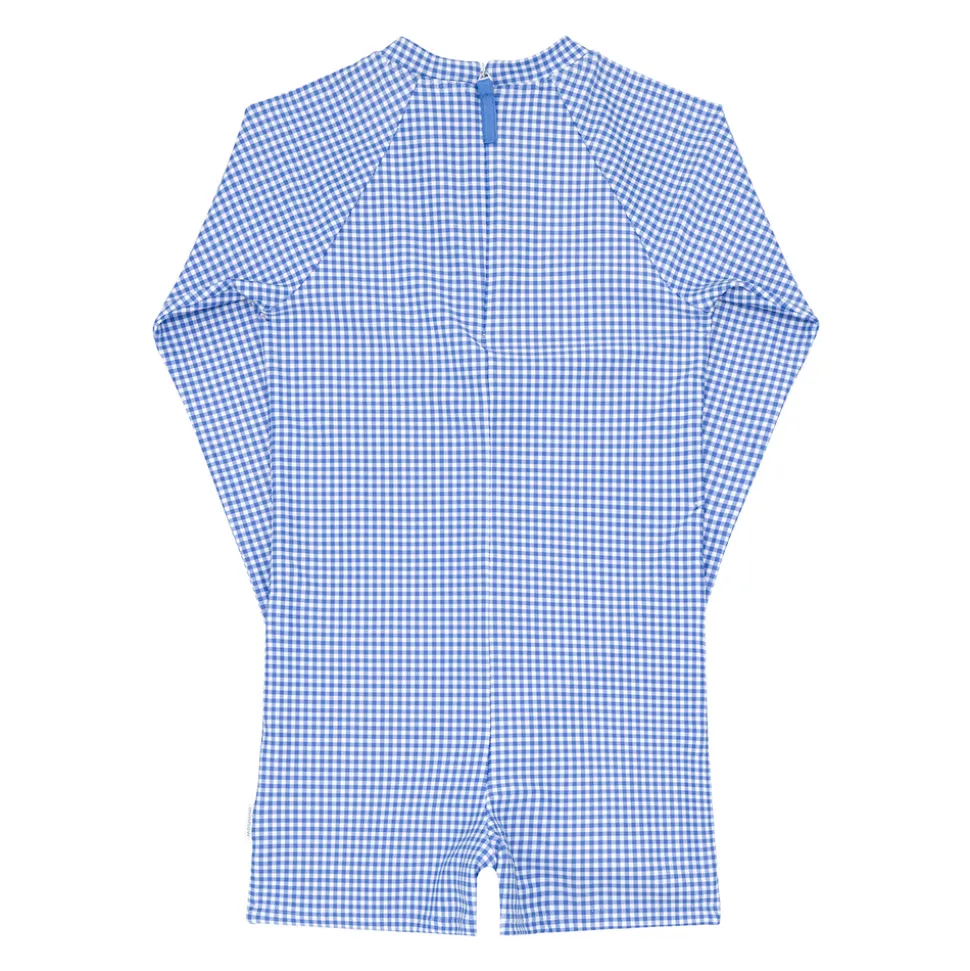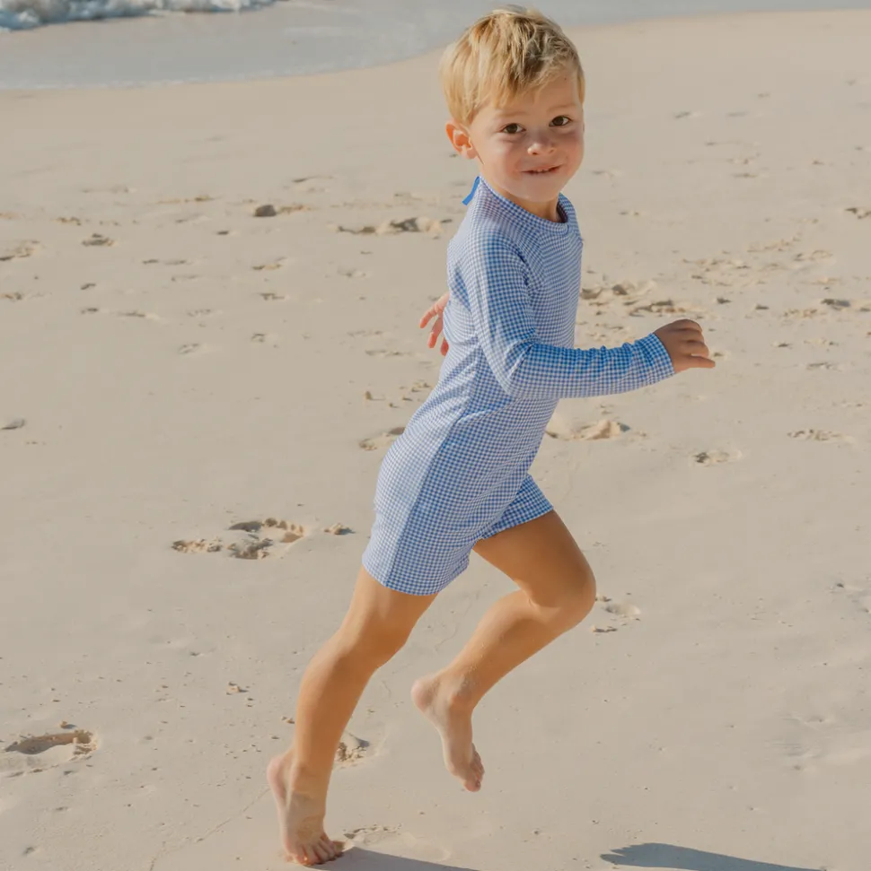 A family favorite for its clean lines and simple details, minnow creates pieces that are playful, polished, and thoughtfully designed for long days, sandy toes, and the wonderment of life on the shore. Featuring long sleeves for more sun-safe coverage, the Unisex Sky Blue Gingham Rashguard One Piece Piece has a clean invisible zipper tab for easy access and is crafted in a buttery soft fabric that’s fully lined, except for the sleeves, allowing for both movement and breathability.