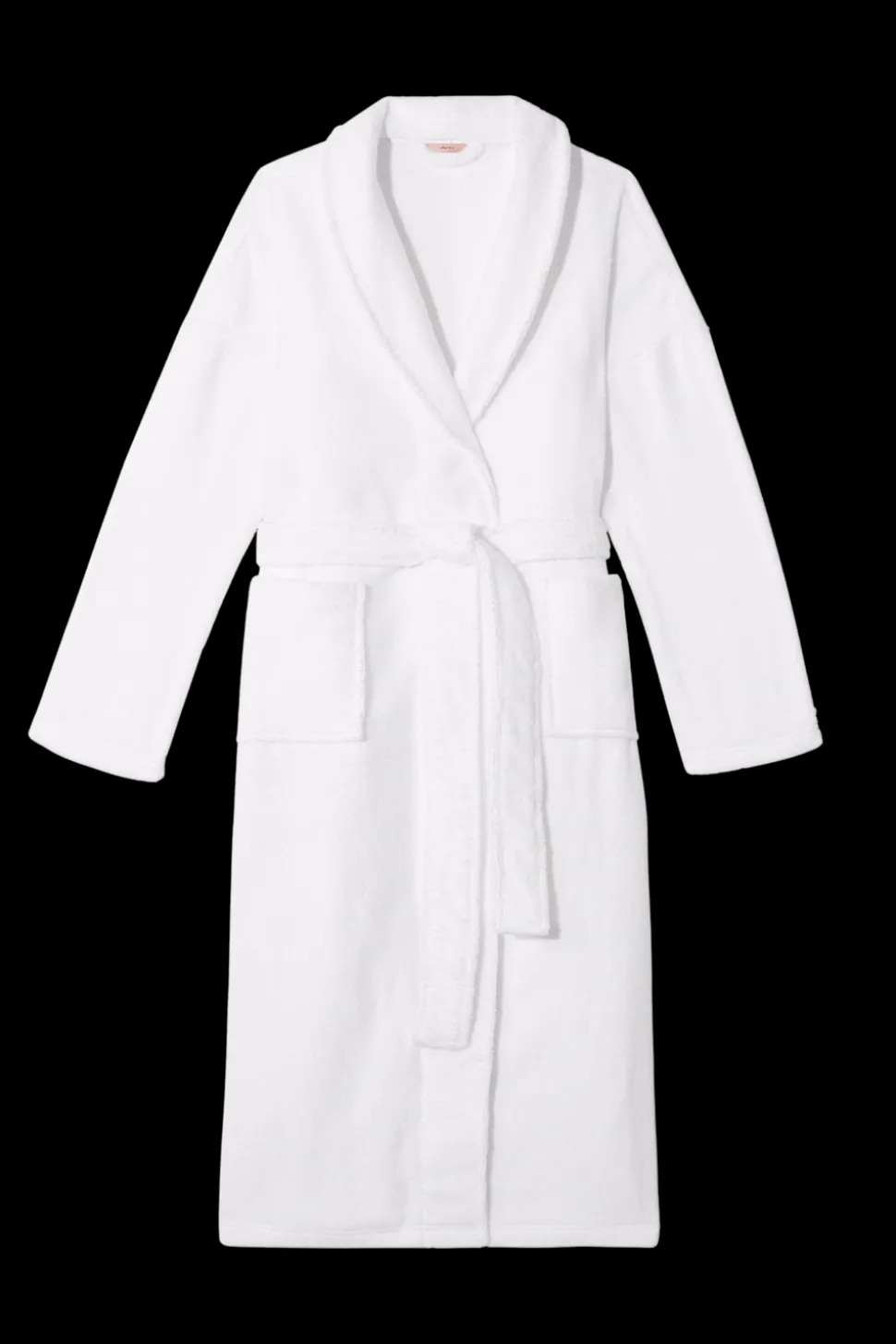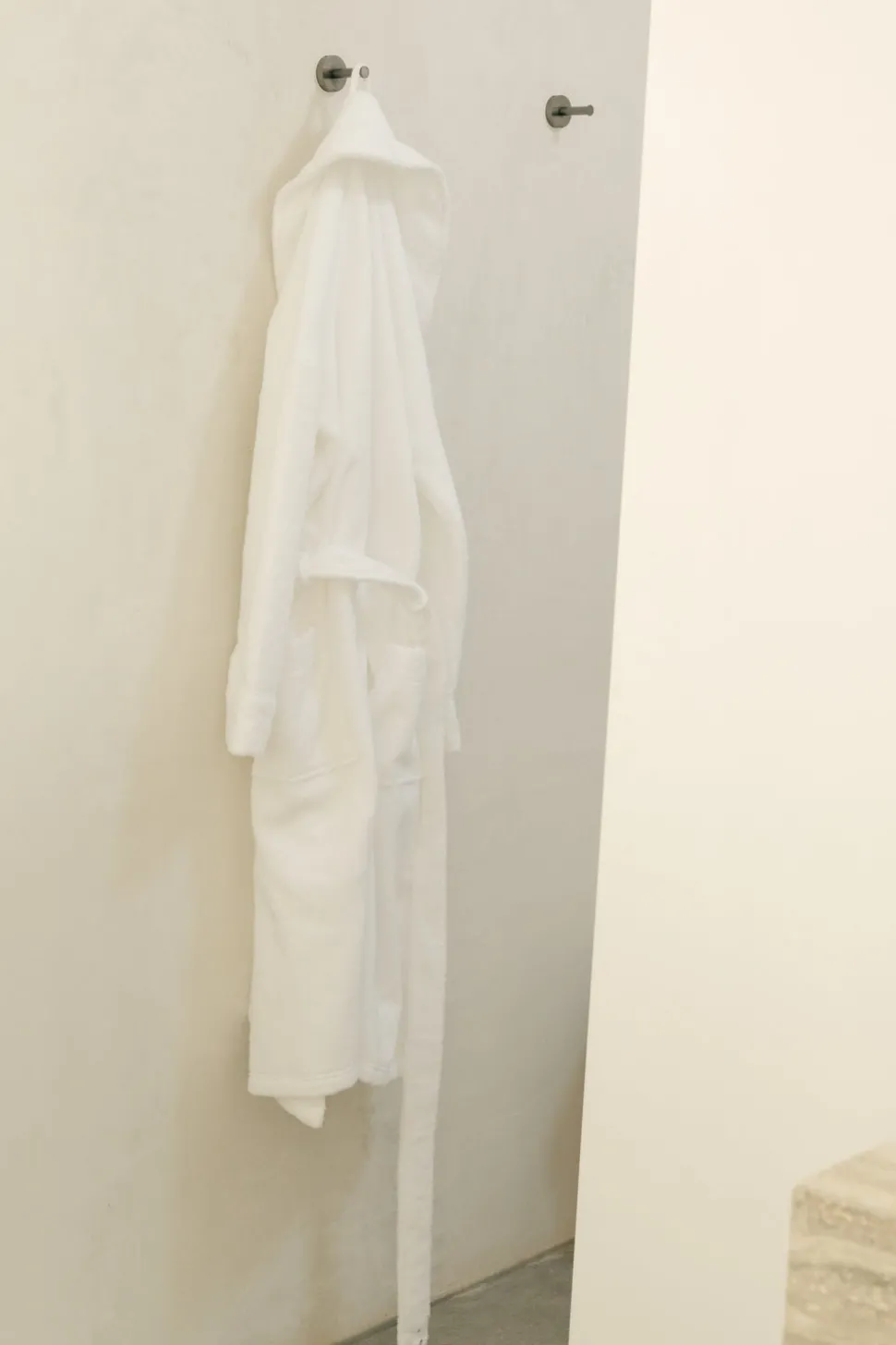 100% Cotton Terry. Shawl Collar. Patch pockets. Removable Tie belt. Locker loop for hanging at back neck
