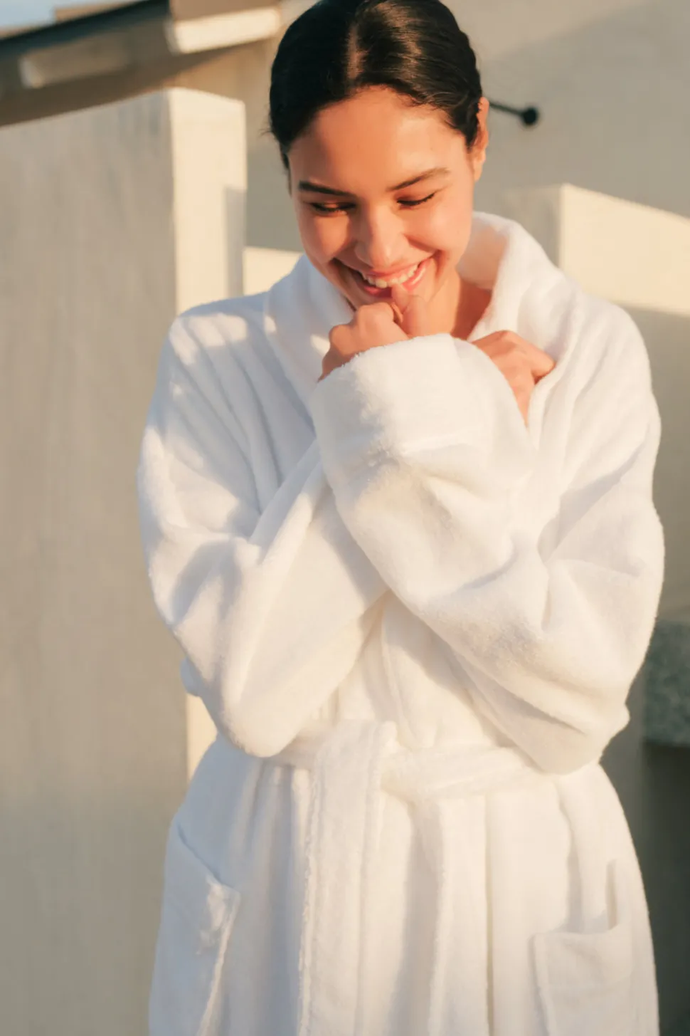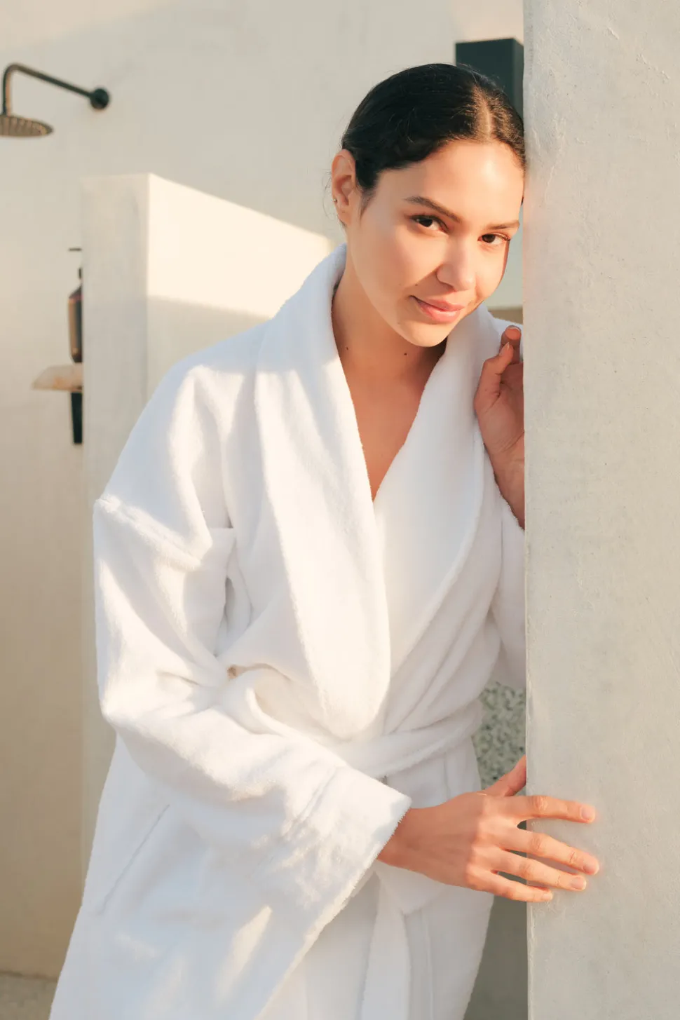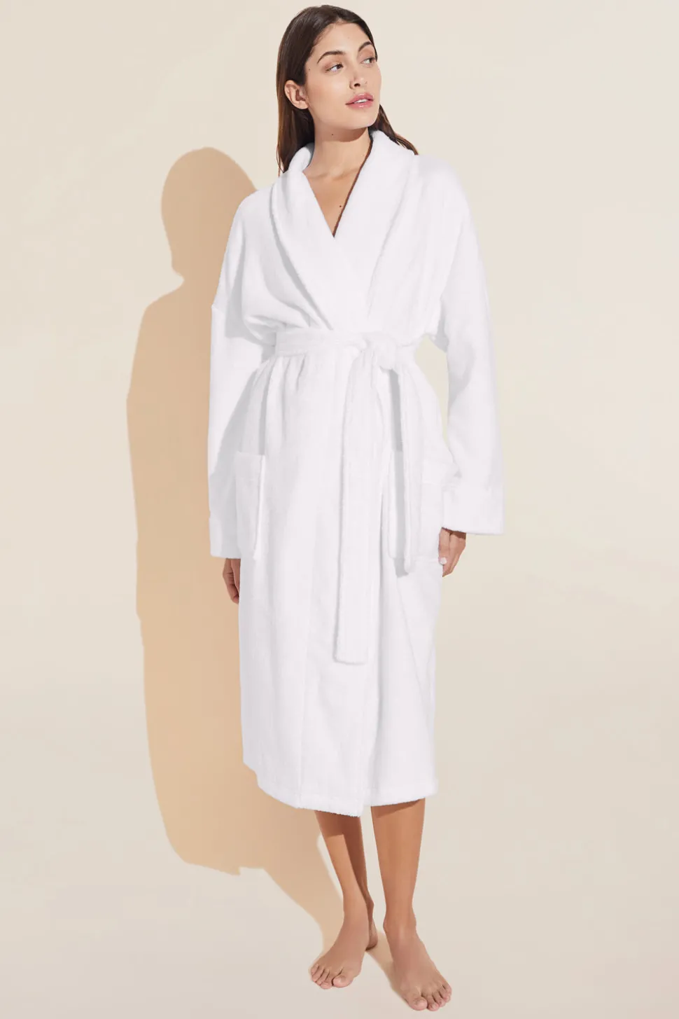 In 1996, Eberjey co-founders Ali and Mariela understood the visceral desire for beautiful, functional sleepwear that supported sleep and individual style. At last, pajamas can be sensual, comfortable, tailored, and effortless. Crafted in the softest cotton terry, through a process that includes harmful chemicals and dyes, the Unisex Terry Robe is absorbent, comfy luxury at its finest. Featuring chic details like a shawl collar, removable tie, and pockets, it’s not only what you, and he, will want to put on after after a shower—neither of you will want to take it off.