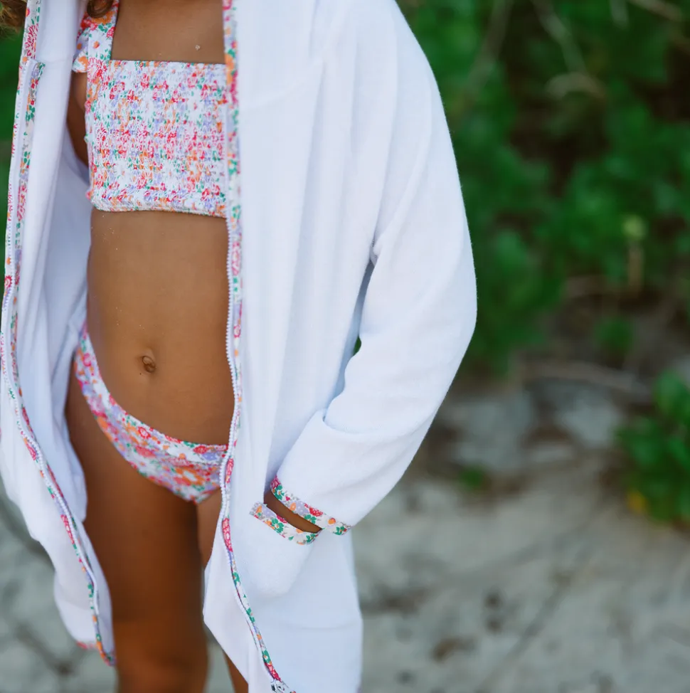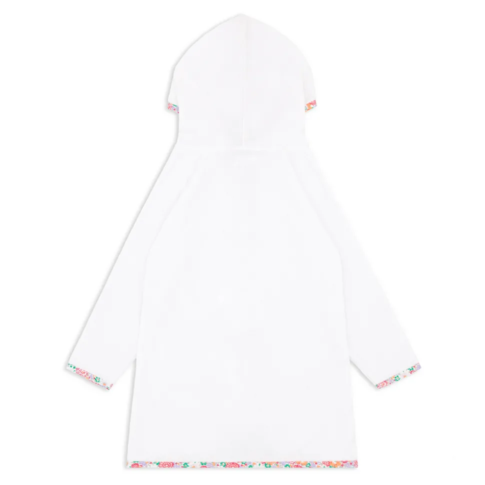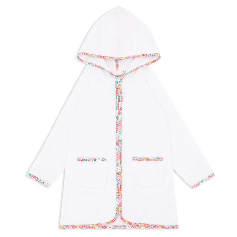 A family favorite for its clean lines and simple details, minnow creates pieces that are playful, polished, and thoughtfully designed for long days, sandy toes, and the wonderment of life on the shore. Featuring a fun gingham print with a drawstring cord. Made in premium, super-absorbent French terry, the Unisex White French Terry Hooded Zipper Coverup With Island Blossom Trim is designed with front pockets, a convenient in-and-out zip front, and a generously sized hood, allowing your littles to stay cozy and comfortable post-swim.
