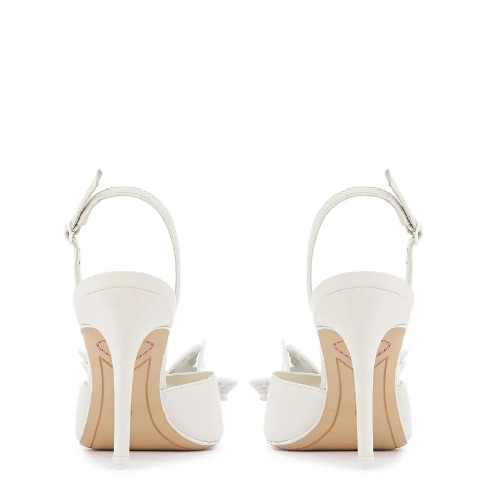 London-based Sophia Webster burst onto the scene in 2013, instantly renowned for her uniquely uplifting designs.With a background in fine art, and an eye for quality, inclusivity and sustainability, she creates footwear and accessories that embrace both an incredible fantasy and a gorgeous reality. Paired elegantly with a fresh white leather upper, the Vanessa Mid Sandal features fine ankle straps that entwine the foot and are adorned with high-gloss leather butterflies.