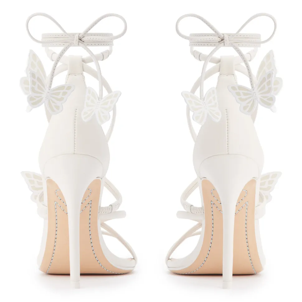 London-based Sophia Webster burst onto the scene in 2013, instantly renowned for her uniquely uplifting designs.With a background in fine art, and an eye for quality, inclusivity and sustainability, she creates footwear and accessories that embrace both an incredible fantasy and a gorgeous reality. Paired elegantly with a fresh white leather upper, the Vanessa Sandal features fine ankle straps that entwine the foot and are adorned with high-gloss leather butterflies.
