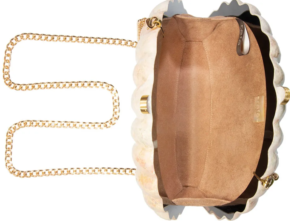 White kabibe shell. Magnetic snap closure. Drop-in detachable gold chain strap. Fully lined. Made in the Philippines.