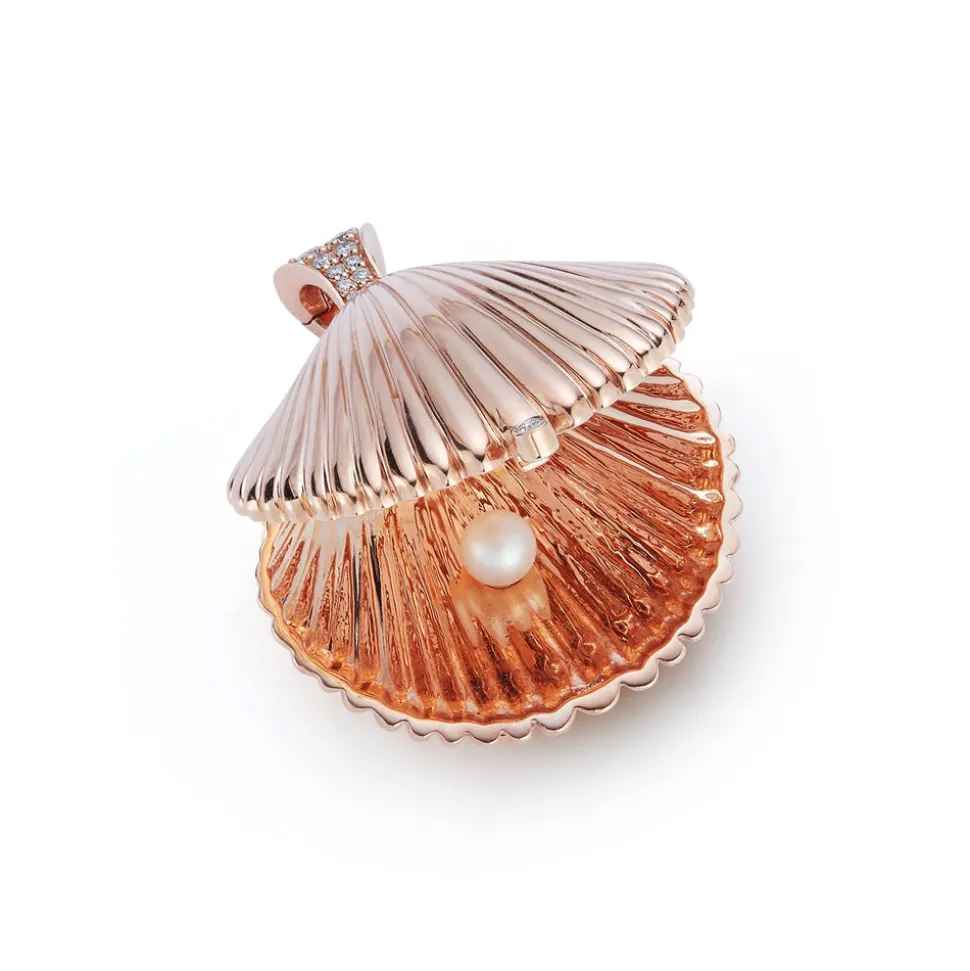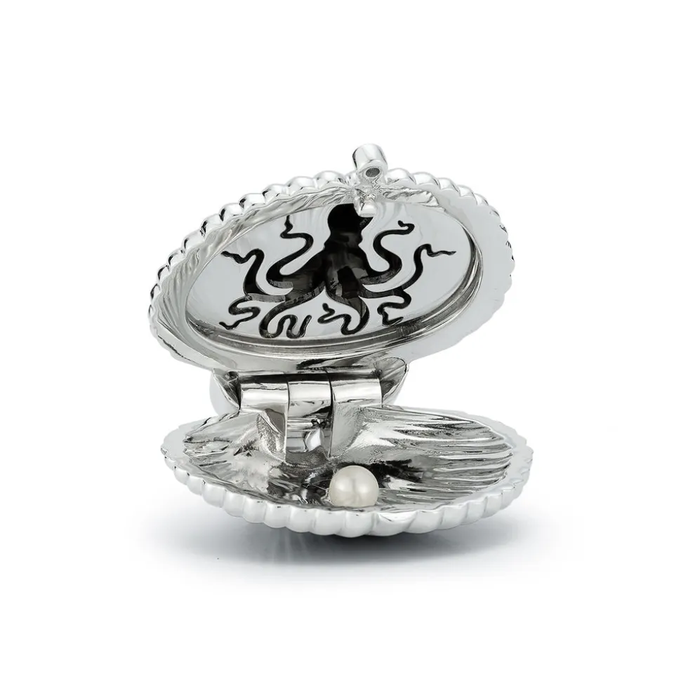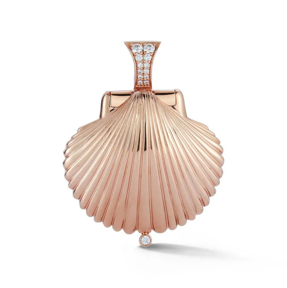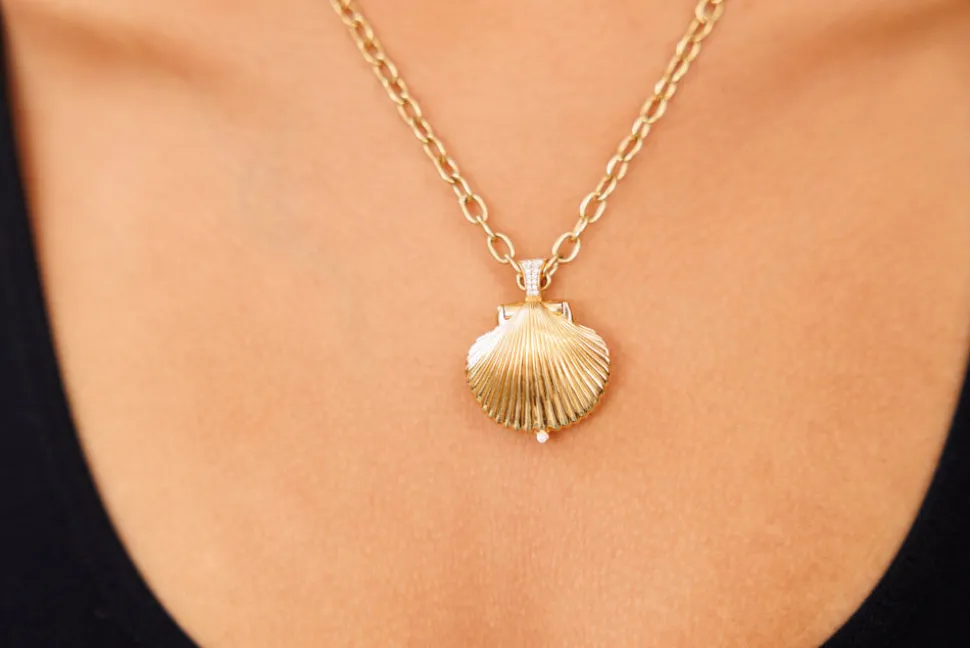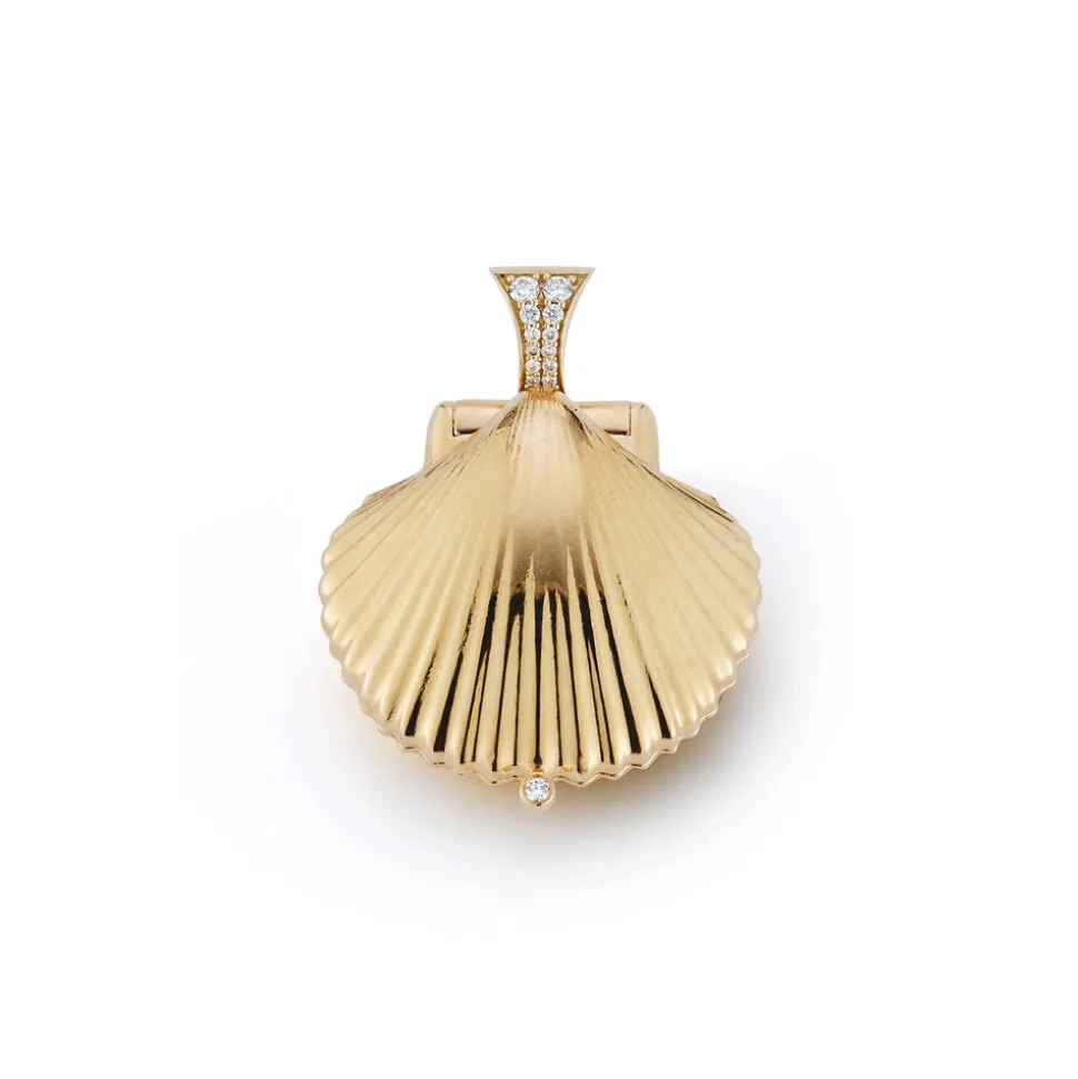 Inspired by her mother, who made golden jewelry from shells found near their home in Southern California, Renna Brown-Taher creates jewels of exquisite quality from the natural world, with minimal impact upon it. The Venus Locket is a celebration or the sea. The gold shell encases a gleaming pearl opposite side a whimsical engraved octopus. The locket is finished with a diamond bale and safety clasp.