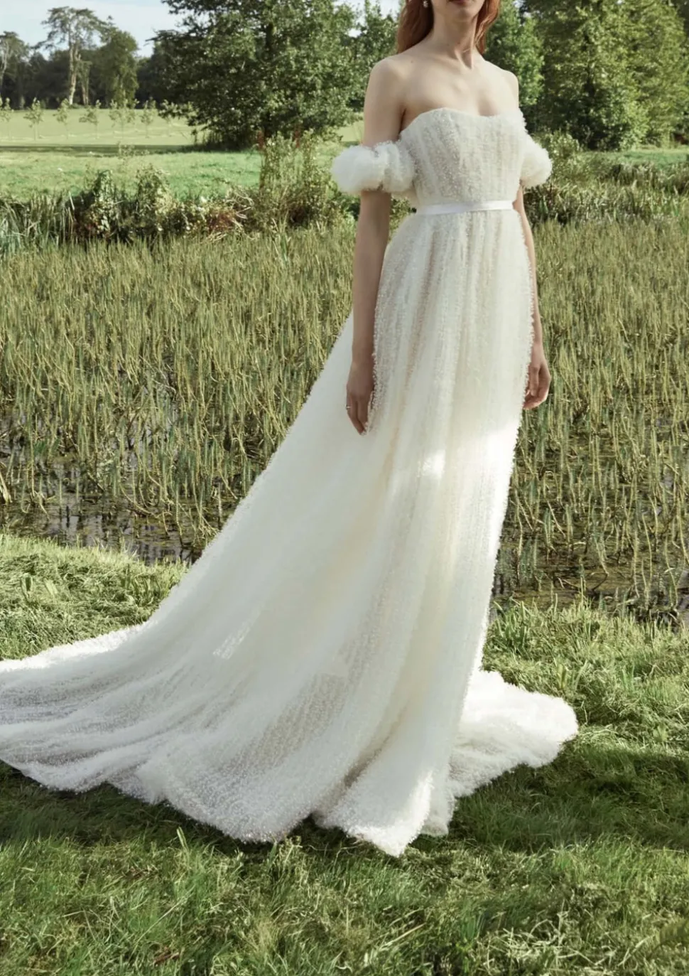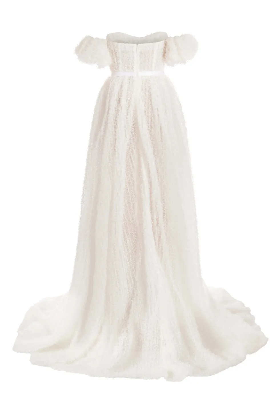 Named after a radiant group of galaxies, Markarian combines designer Alexandra O’Neill’s love of the cosmos and celestial romanticism with timeless design and modern silhouettes. A forward-thinking approach to fashion and a focus on fine craftsmanship mean Markarian is beautiful and impeccably well-made. Crafted in a light, ethereal fabric, the Venus White Dotted Tulle Gown is endlessly glamorous with its off-the-shoulder cut, puff sleeve, and sweetheart neckline. Our favorite part: the cinched waist, which provides a final flattering touch.