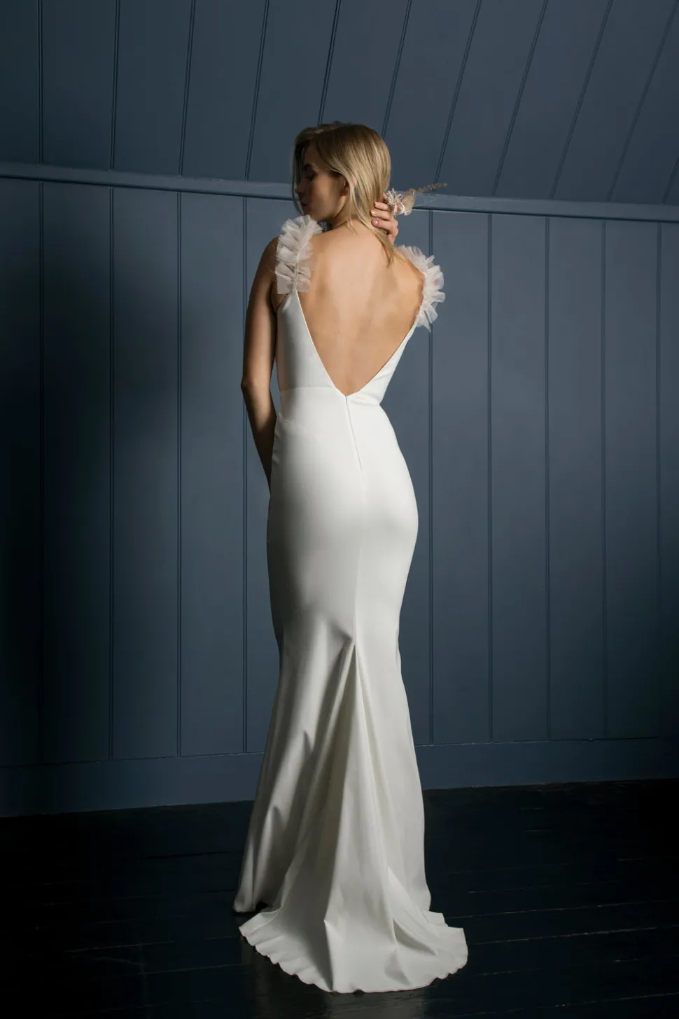Luxury bridalwear brand Halfpenny London weaves Brit cool with a luxe sensibility, creating innovative, chic dresses and separates for the modern woman. The Victor Frill Dress features a fit-and-flare design with ruched silk organza trim on the straps for a flirty bridal style.