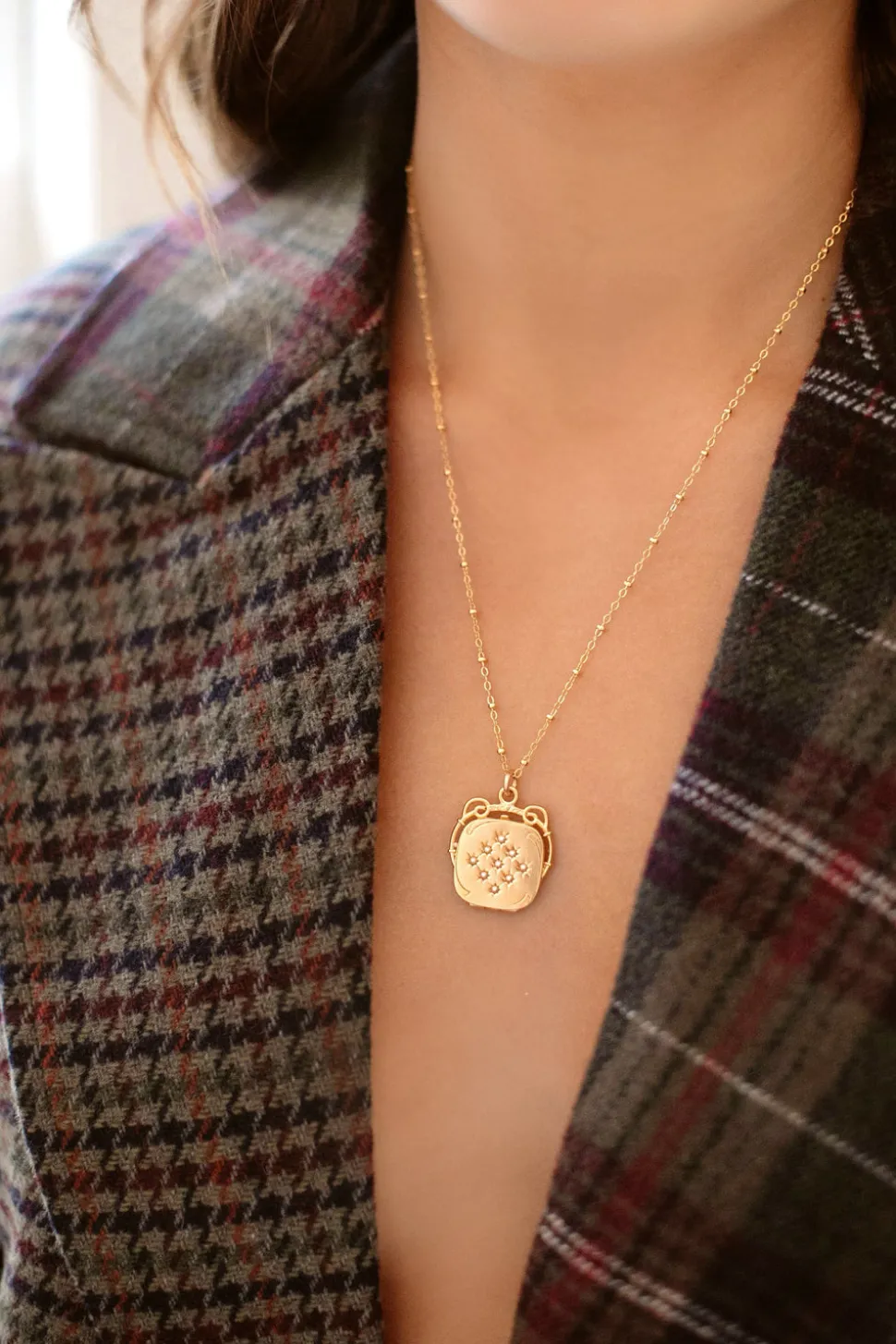 24K antique gold-plated Victorian-style locket featuring a cluster of pearls. Dainty 14/20 gold-filled chain. Adjustable lobster closure.