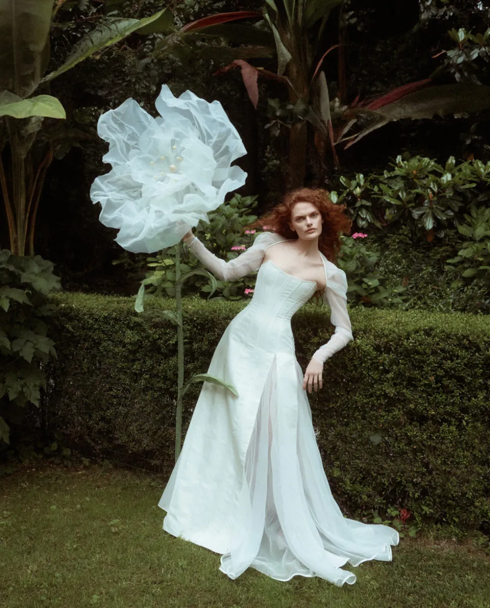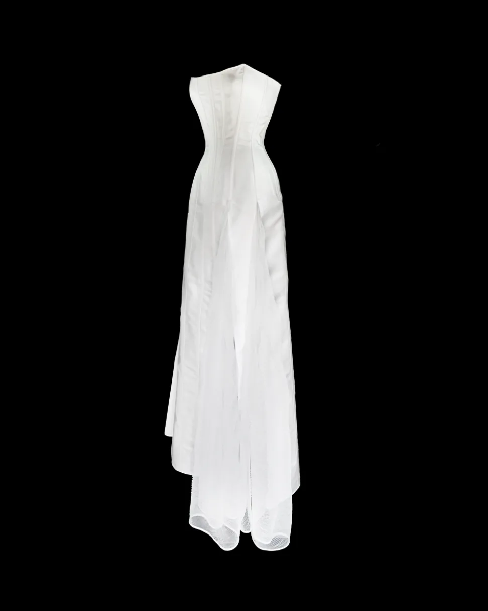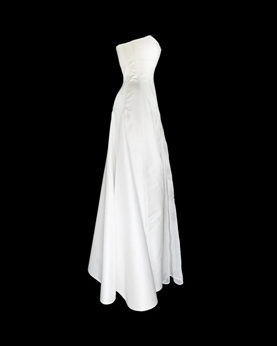 Milanese designer Alice Pons looks to traditional corsets, based on original historical designs, and transforms them into thoroughly contemporary pieces through bold and innovative design. The Victorian Maxi Gown is inspired by 19th-century gowns, featuring the iconic hourglass shape that curves around the ribs and sculpts the figure down to just below the high hip. This unique strapless dress features a lace-up back opening and asymmetrical inserts of volume on both the front and back, creating a distinctive silhouette. The front inserts in matching sheer mesh fabric form two side slits, subtly revealing the legs without being too showy. An invisible side zip closure ensures easy fastening. The puffy sleeves, made from the same sheer ivory mesh as the dress, are detachable, making them the perfect addition to complete the look. They elegantly cover the shoulders for the ceremony and add a touch of delicate volume.