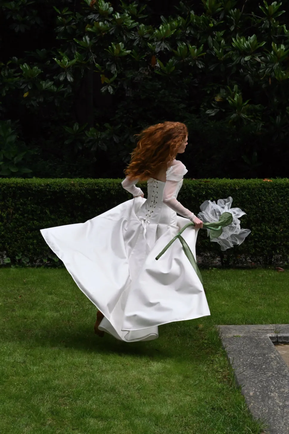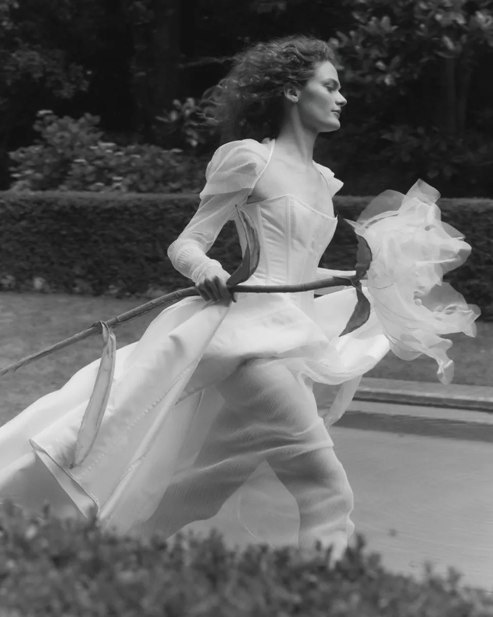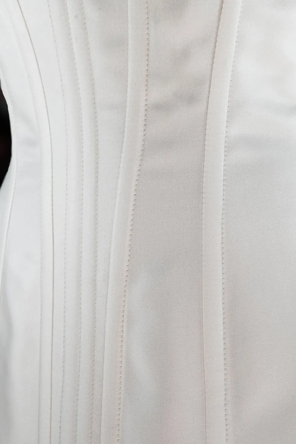 Milanese designer Alice Pons looks to traditional corsets, based on original historical designs, and transforms them into thoroughly contemporary pieces through bold and innovative design. The Victorian Maxi Gown is inspired by 19th-century gowns, featuring the iconic hourglass shape that curves around the ribs and sculpts the figure down to just below the high hip. This unique strapless dress features a lace-up back opening and asymmetrical inserts of volume on both the front and back, creating a distinctive silhouette. The front inserts in matching sheer mesh fabric form two side slits, subtly revealing the legs without being too showy. An invisible side zip closure ensures easy fastening. The puffy sleeves, made from the same sheer ivory mesh as the dress, are detachable, making them the perfect addition to complete the look. They elegantly cover the shoulders for the ceremony and add a touch of delicate volume.