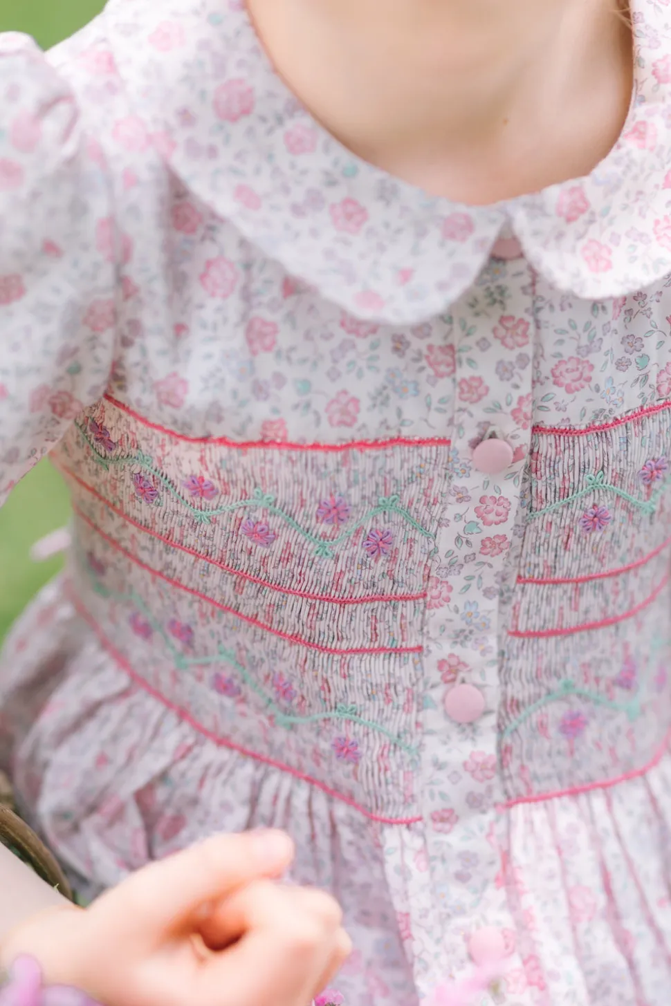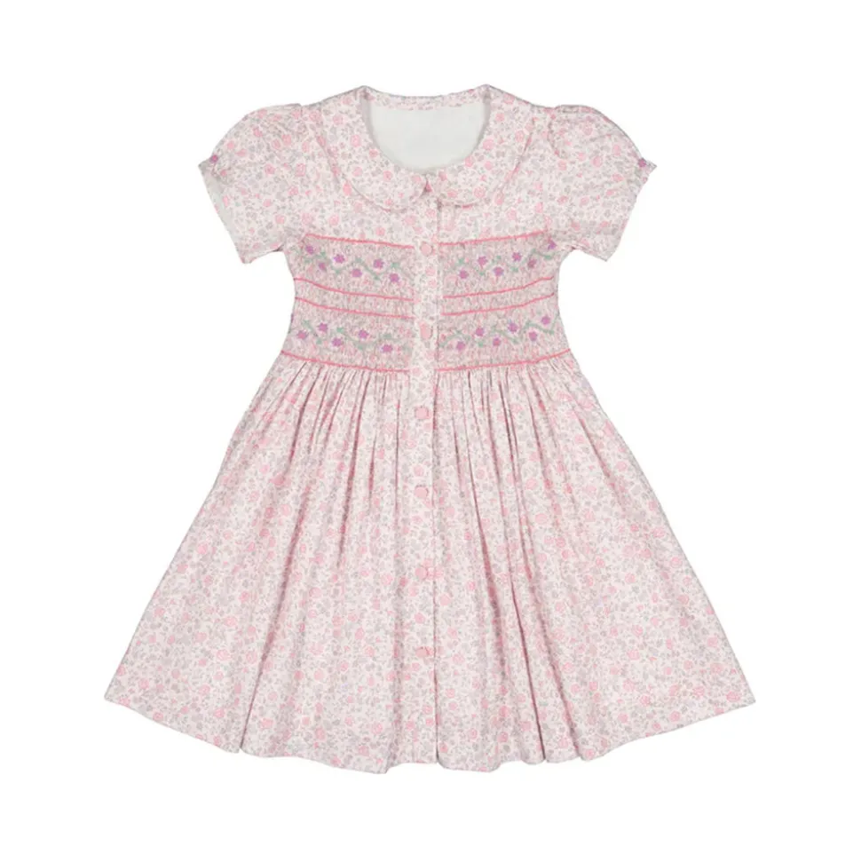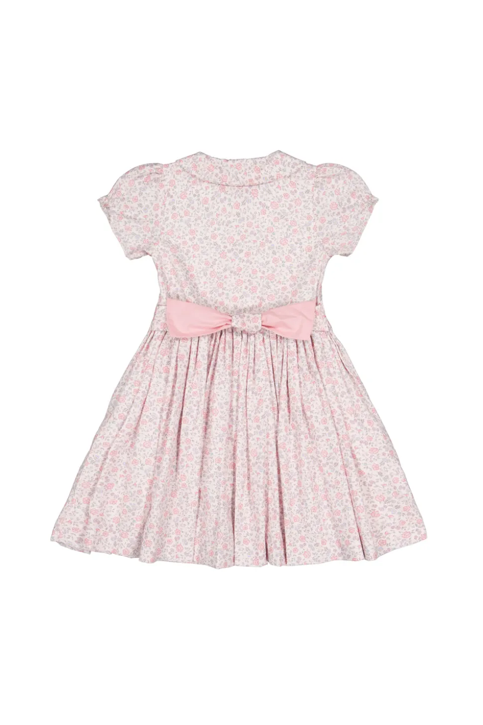 100% cotton. Floral blue smocked dress with short puff sleeves. Peter Pan collar. Blue, pink, and yellow flowers embroidered on the chest. Blue reversible back statement bow and covered back buttons. Available from sizes 3M to 24M, ensuring a complete and adorable look for little ones.