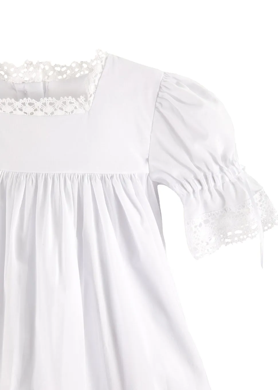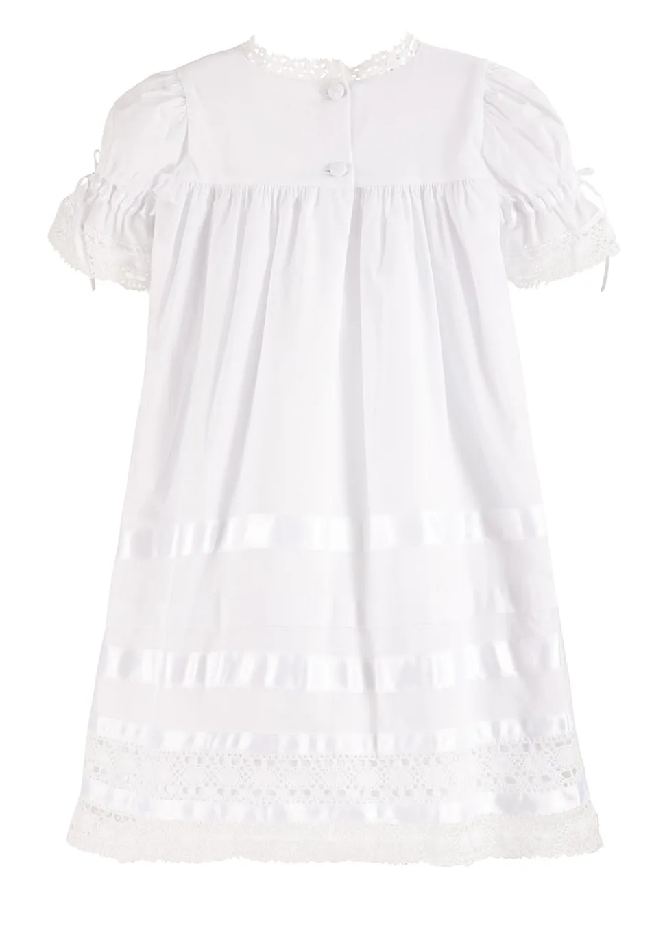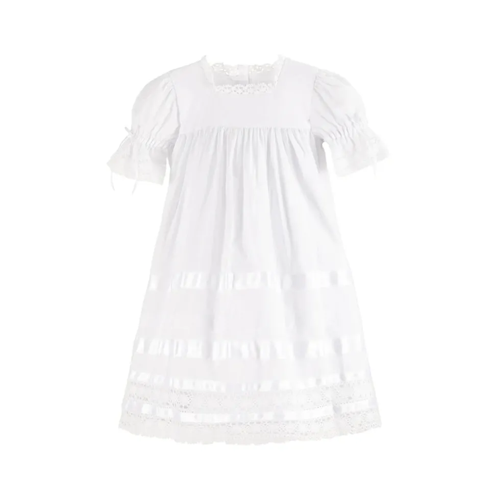 Using artisan seamstresses to craft small orders of their heirloom pieces, Strasburg Children pays special attention to details—French seams, built-in slips, and fabric-covered buttons—for lasting quality and comfort. Soft lace accents on the sleeve, neckline, and hem, as well as delicate satin ribbon bands, give the Virginia Lace Flower Girl Dress its darling vintage look. Your little one will easily be the best-dressed at weddings, Christenings, Easter brunch, or any event that calls for an elegant white dress.