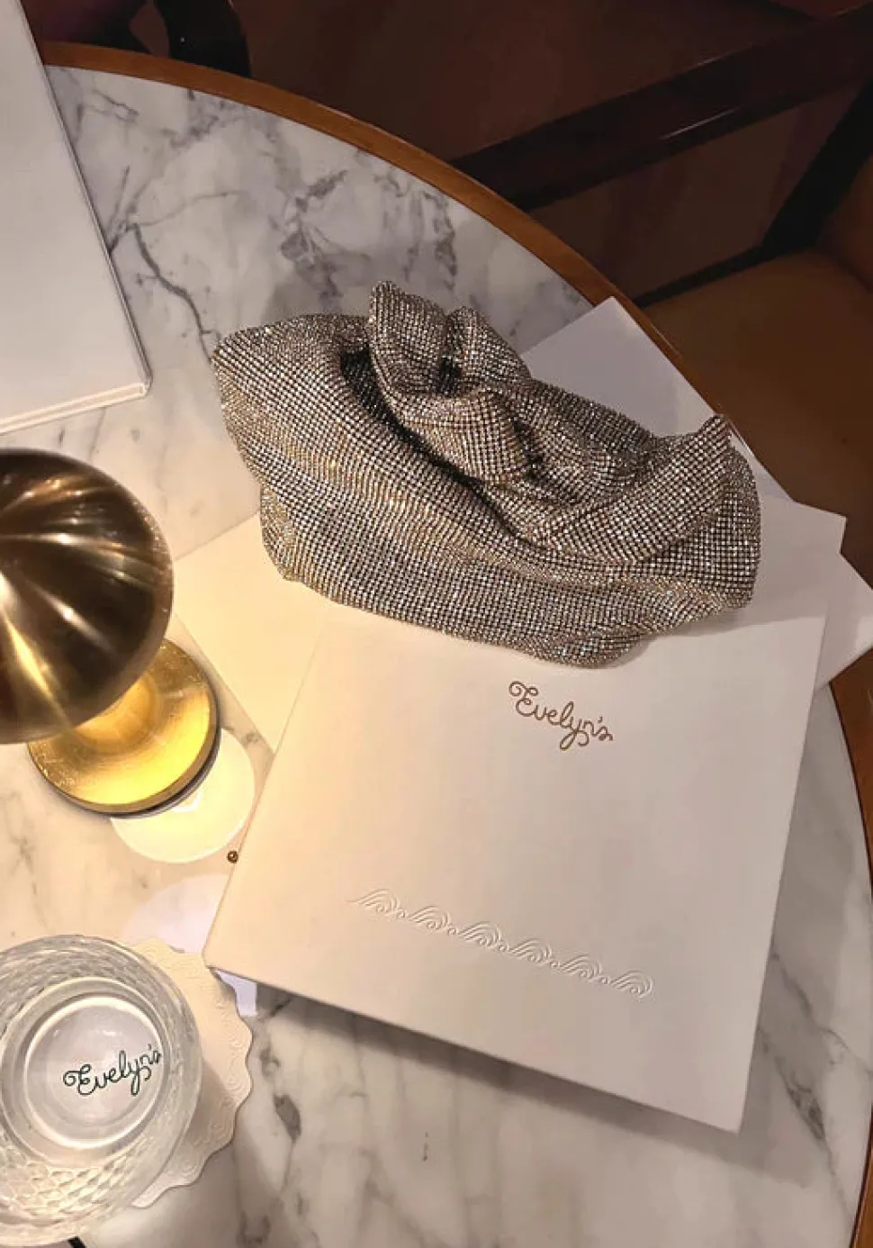 Swarovski silver in mesh. Silver hardware. Black satin interior.