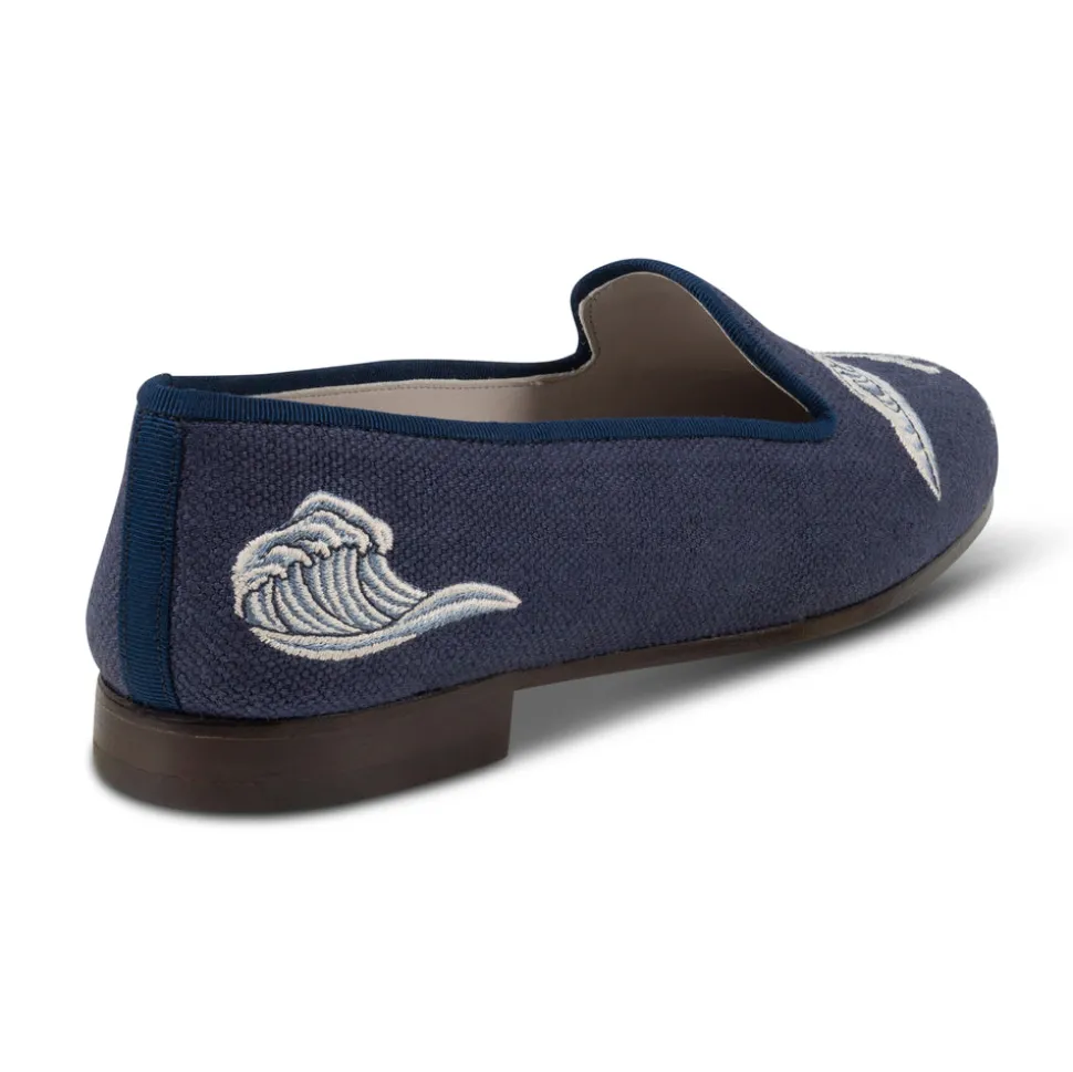 Founded in Palm Beach, Florida, Stubbs & Wootton has perfected the art of creating elevated, handmade women’s, men’s, and children’s shoes. Known for their exquisite needlepoint and embroidery, their slippers showcase all-over patterns and fun, intricate accents—it’s old sport fashion but for the grandmillennial generation. A collaboration with Gracie, who for over 120 years has crafted the finest hand painted wallpaper that has graced the walls of some of the most notable homes in the world. The Waves Indigo Linen Slipper is made with a blend of rich linen and cotton, and tonal blue cotton grosgrain. The embroidery captures the essence of the ocean with blue and white Gracie Waves.