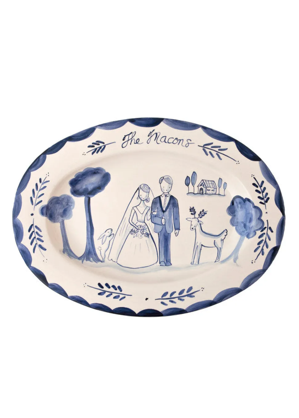 Self-taught artist Tricia Lowenfield crafts one-of-a-kind whimsical pieces that will become family treasures in time. This made-to-order custom Wedding Platter features a delicate drawing of the happy couple to memorialize their day. Personalize it with their last name for the ultimate gift.