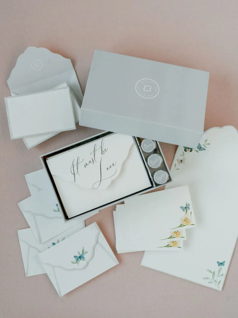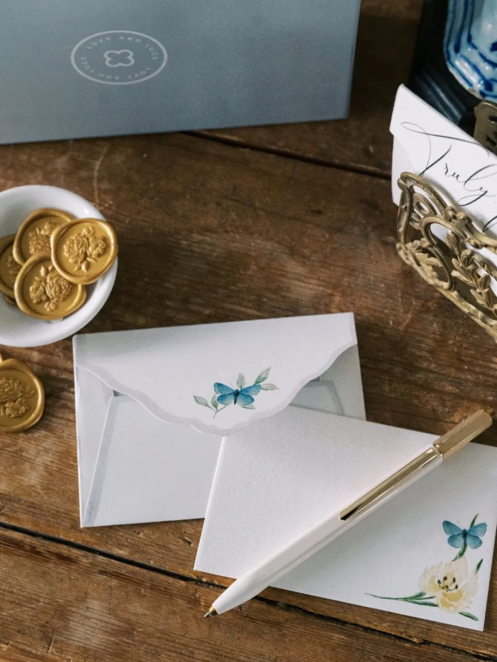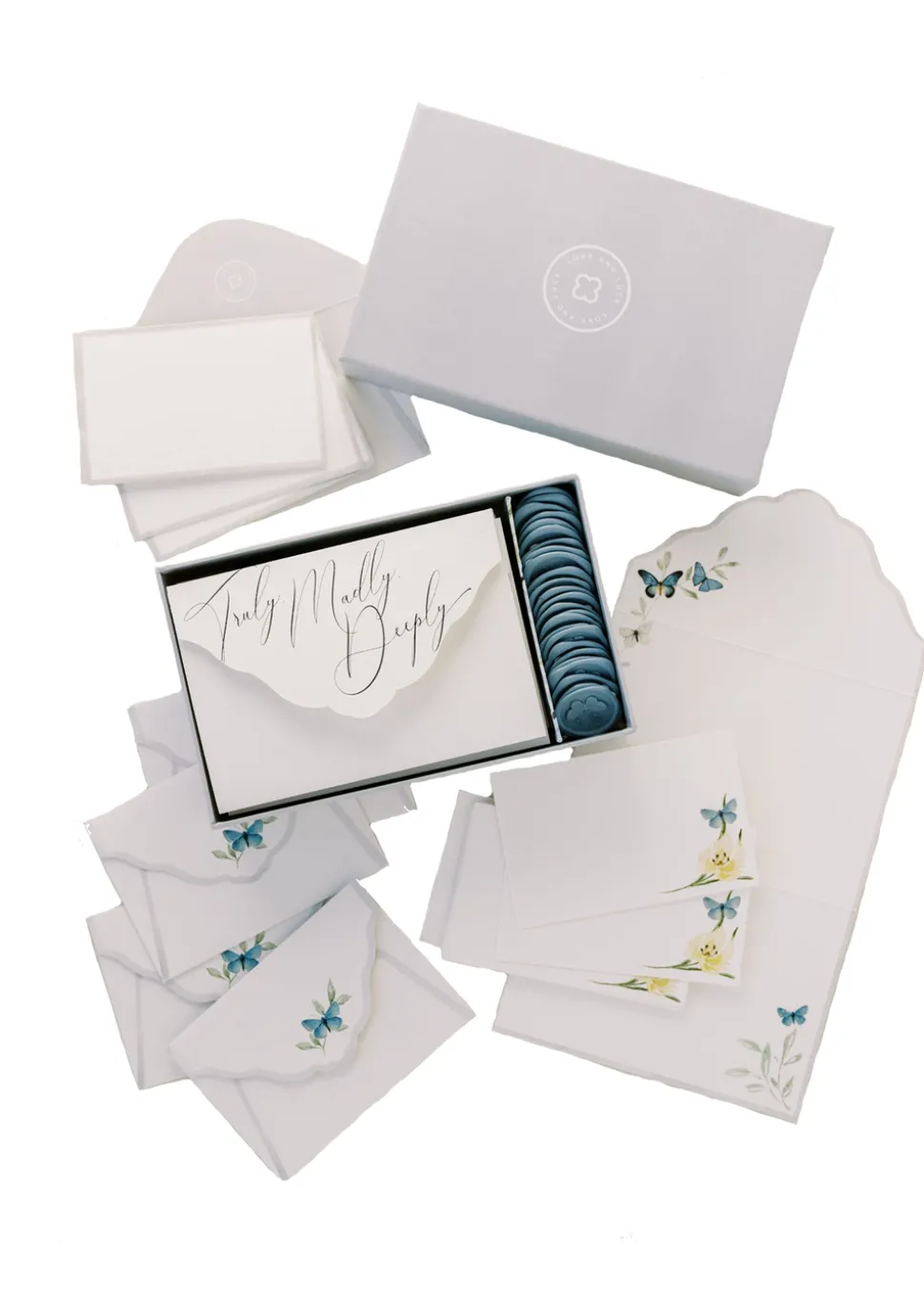 The box set included 10 hand scripted love quote note cards, 20 mini note cards and 30 blue wax seals.