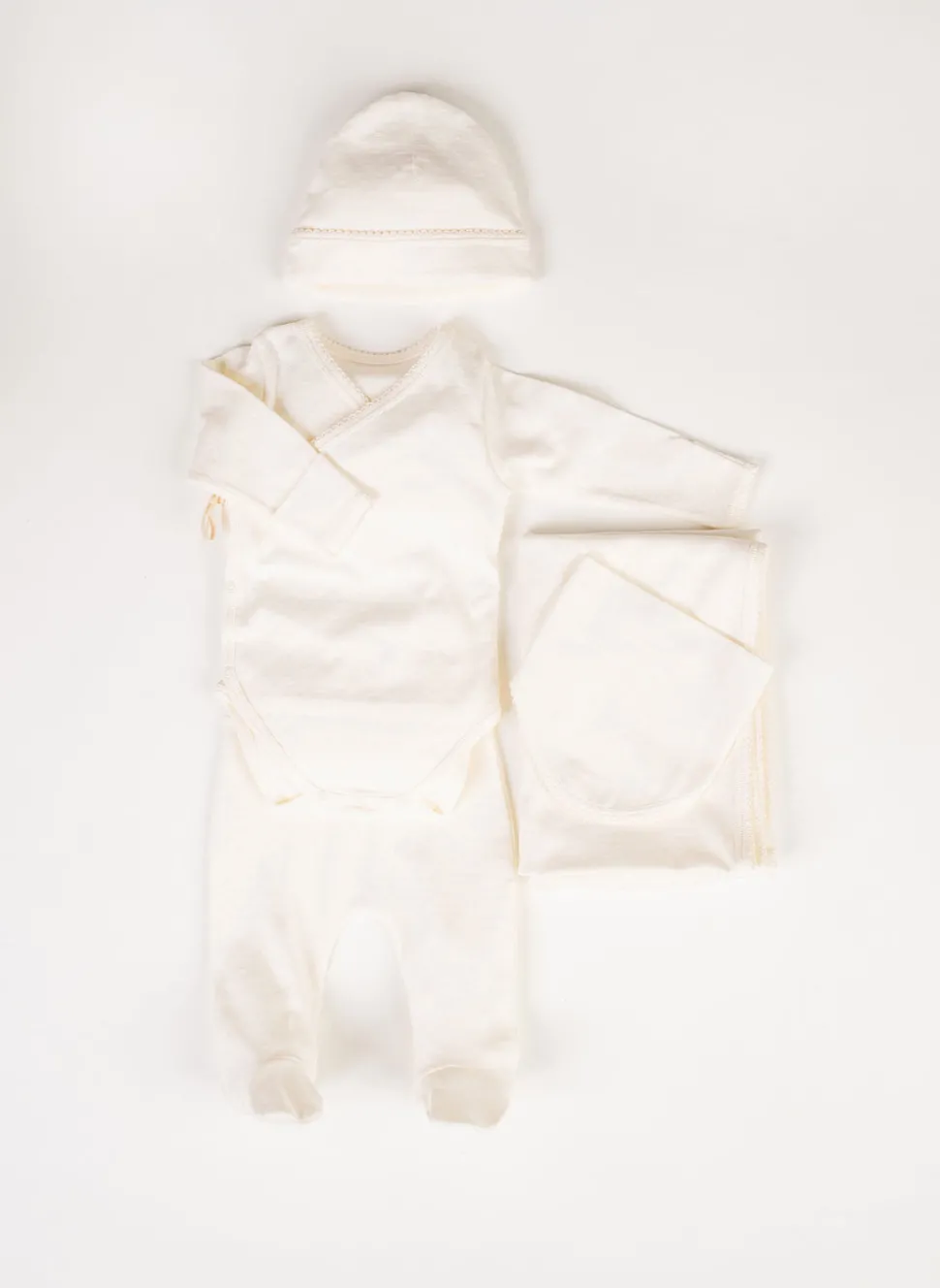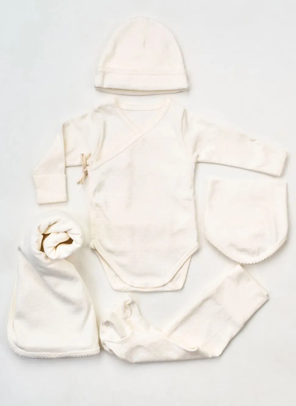 5 piece set. 100% GOTS certified organic cotton, OEKO-TEX certified. Includes: A cozy long-sleeve kimono top with easy snap closures for gentle dressing. Matching footed pants for all-day comfort. A knit hat to keep tiny heads warm. A bib for sweet moments and spills. A butter-soft blanket, perfect for swaddling, cuddles, and beyond. Made in Portugal.