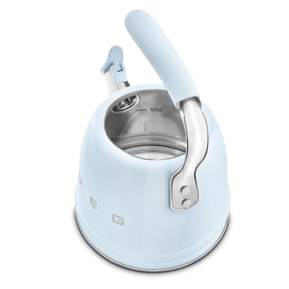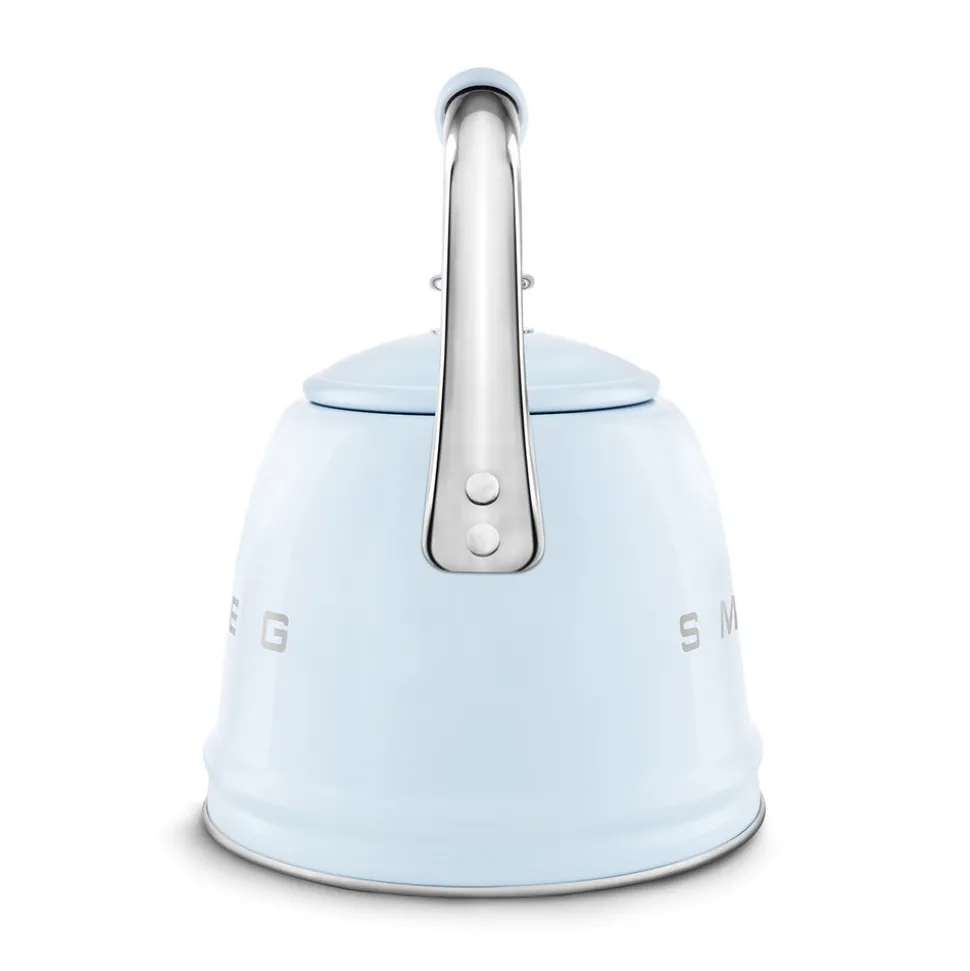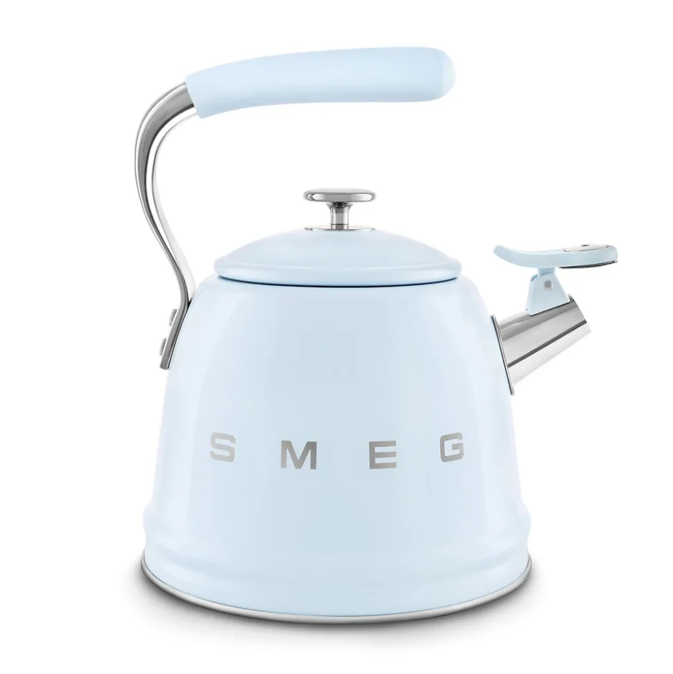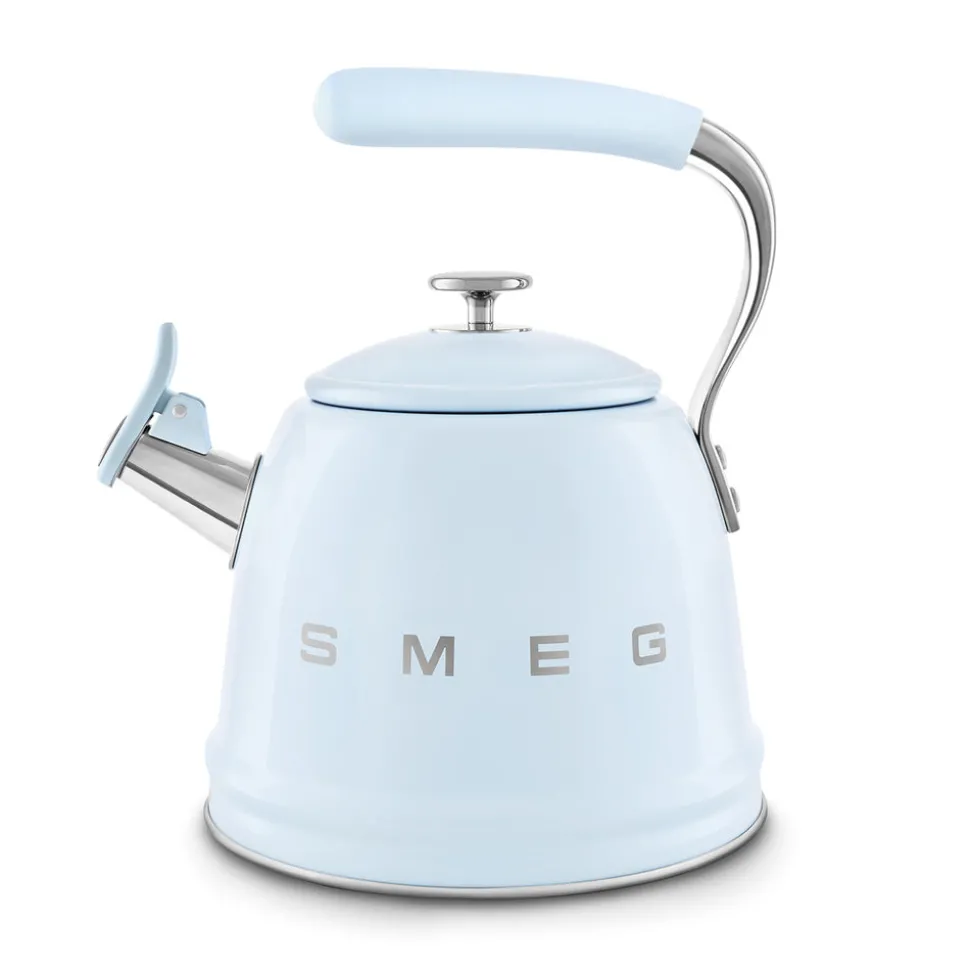 For over 70 years, SMEG kitchen appliances have gained renown for their distinctive design and exceptional functionality, earning their motto ‘Technology with style.’ The Northern Italian firm’s combination of retro aesthetics with cutting-edge technology—in everything from toasters to coffee machines to their signature fridge—sets kitchens apart the world over. The Whistling Kettle CKLW2001 in Pastel Blue is designed for the ultimate brew-maker. This large capacity stovetop piece is a must-have, traditional option whether you are making coffee for two or hosting a tea party.