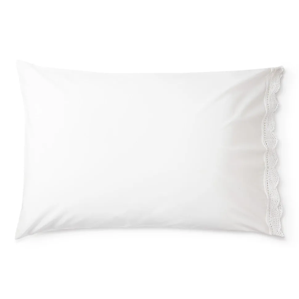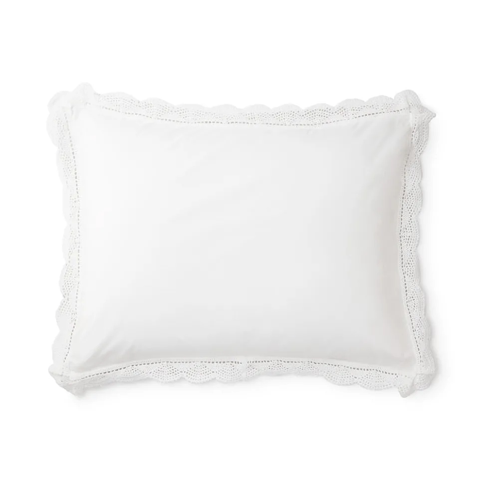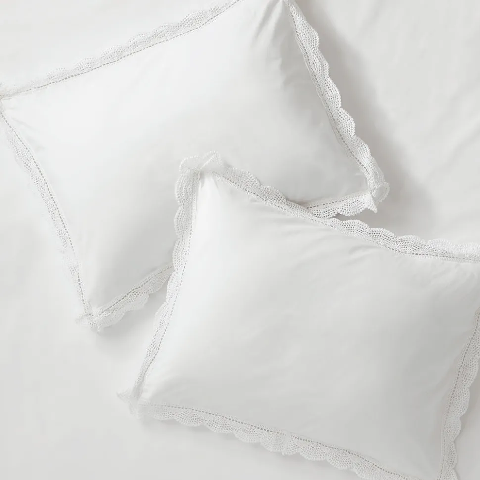 Citing unique origins and ethical sourcing, St. Frank produces contemporary, vintage, and printed homewares that carry the cultural history of the Godavari River community. Working with artisans in under-resourced settings and only using the utmost quality materials, St. Frank marries a sophisticated aesthetic with sustainable social change. The lace trim on the White Meena Percale Pillowcases + Shams represents a 400-year-old fish net tradition spearheaded by women in Indian fishing towns. The delicate, characteristic patterns seen here evolved in the late 19th century, when women were supplied threads by Belgian missionaries.