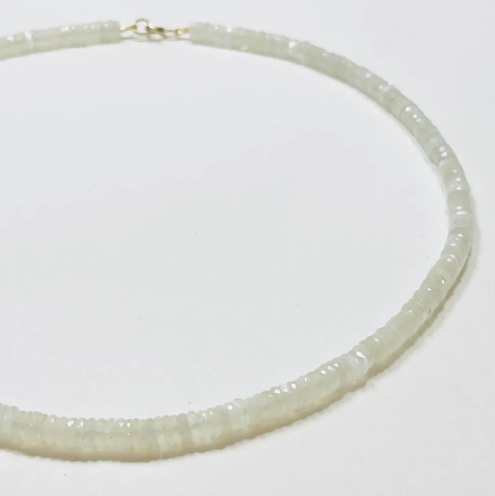 Handmade in Charleston, SC, Theodosia Jewelry captures the quiet elegance of the everyday accessory through thoughtfully chosen precious and semiprecious stones. Each piece is a modern heirloom—crafted with intention, rich with meaning, and designed to be treasured. The White Moonstone Heishi Necklace boasts sparkly white moonstone cut in a heishi shape with a 14-karat gold-filled clasp.