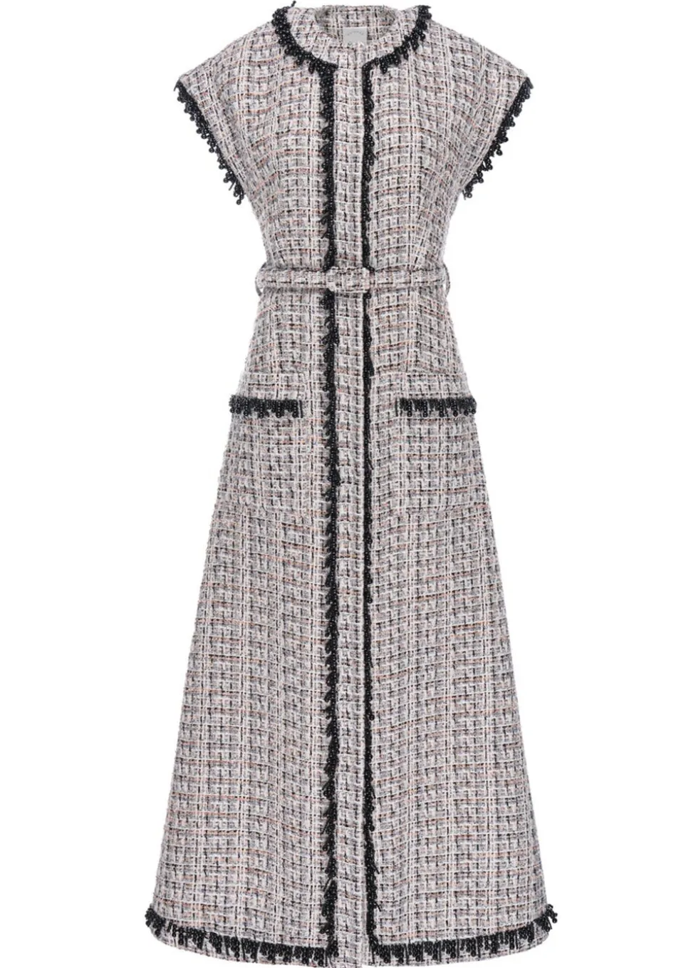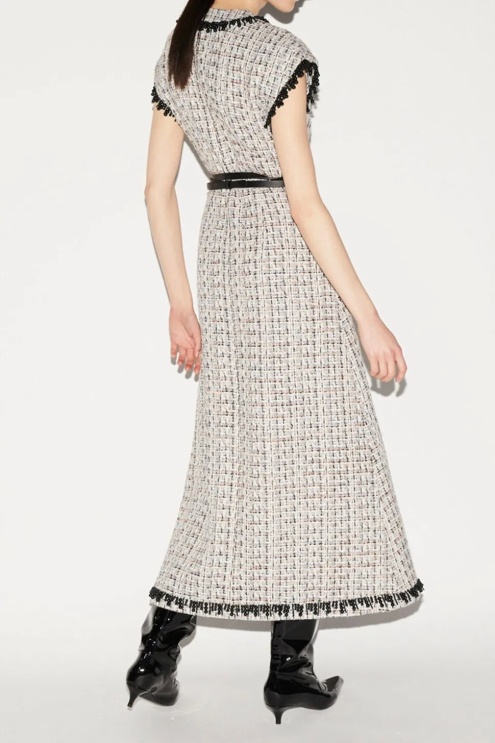 The London-based luxury brand, Huishan Zhang, was launched in 2011. As a Chinese-born designer, Huishan combines his heritage with Western influences to create a sophisticated, signature style. The Whitney Dress in Black and White Tweed is a midi length dress in a wool blend black and white tweed. The dress features a round neck and a cap sleeve for coverage and black beaded trim throughout. Pairs with a tonal tweed belt.