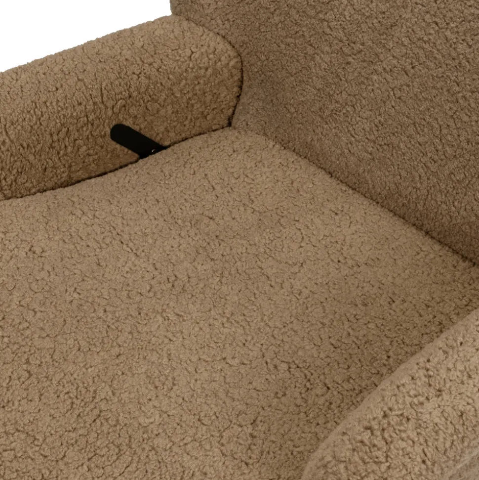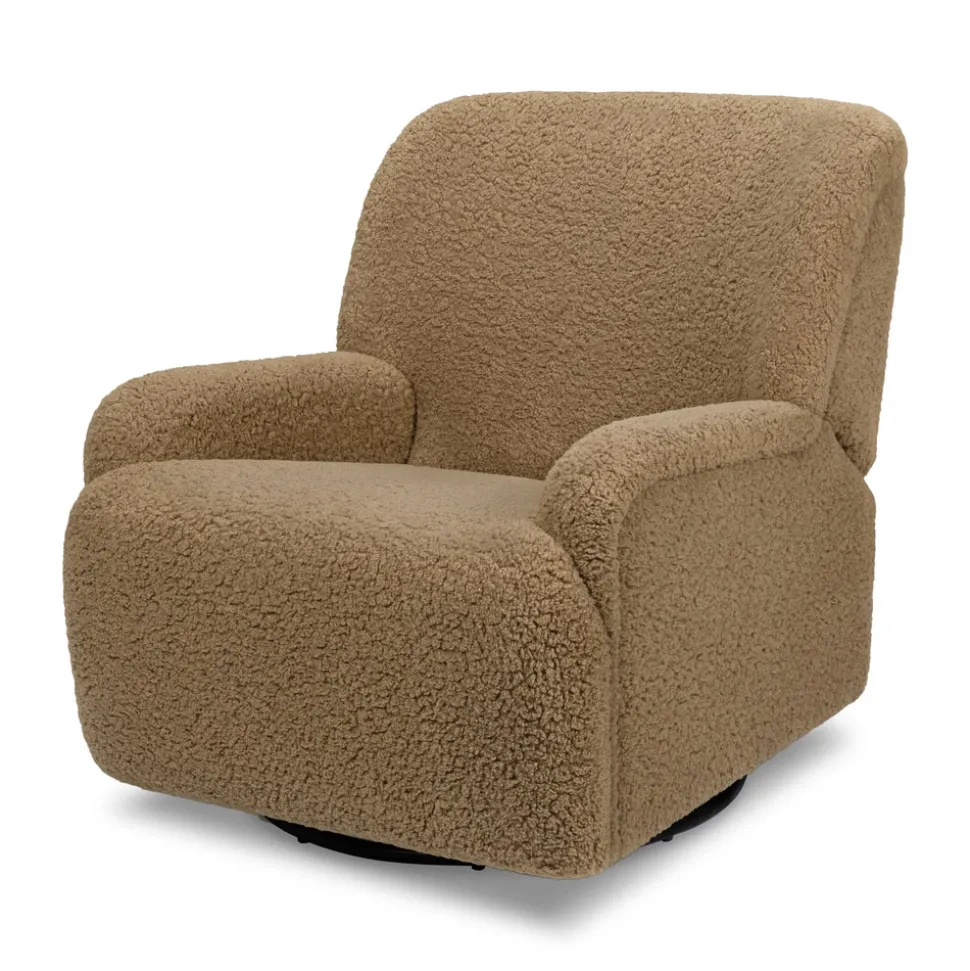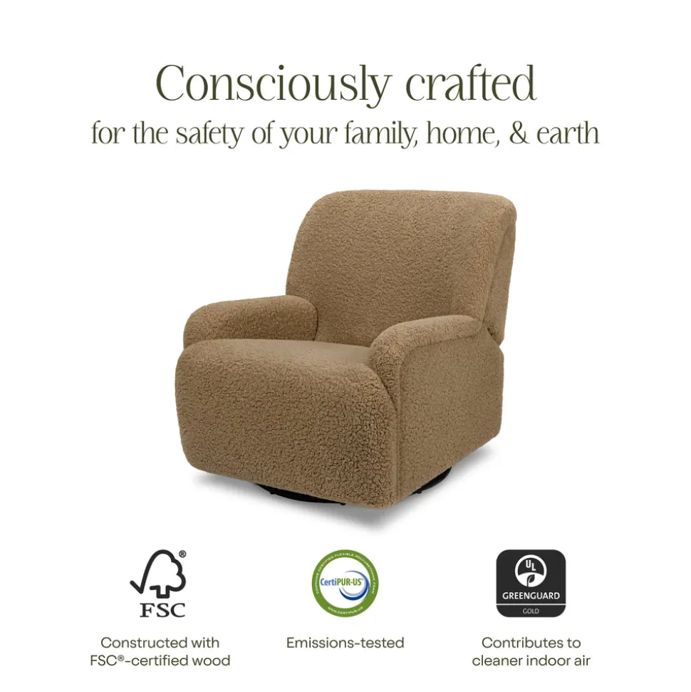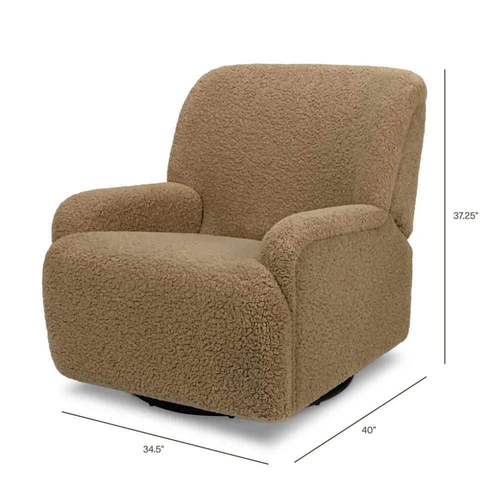 Upholstered in soft cortado faux shearling with a spacious seat and high backrest. Features 360° swivel motion and smooth, hidden recline mechanism. Crafted with a kiln-dried hardwood frame and plush cushioning for durability and comfort. GREENGUARD Gold Certified.
