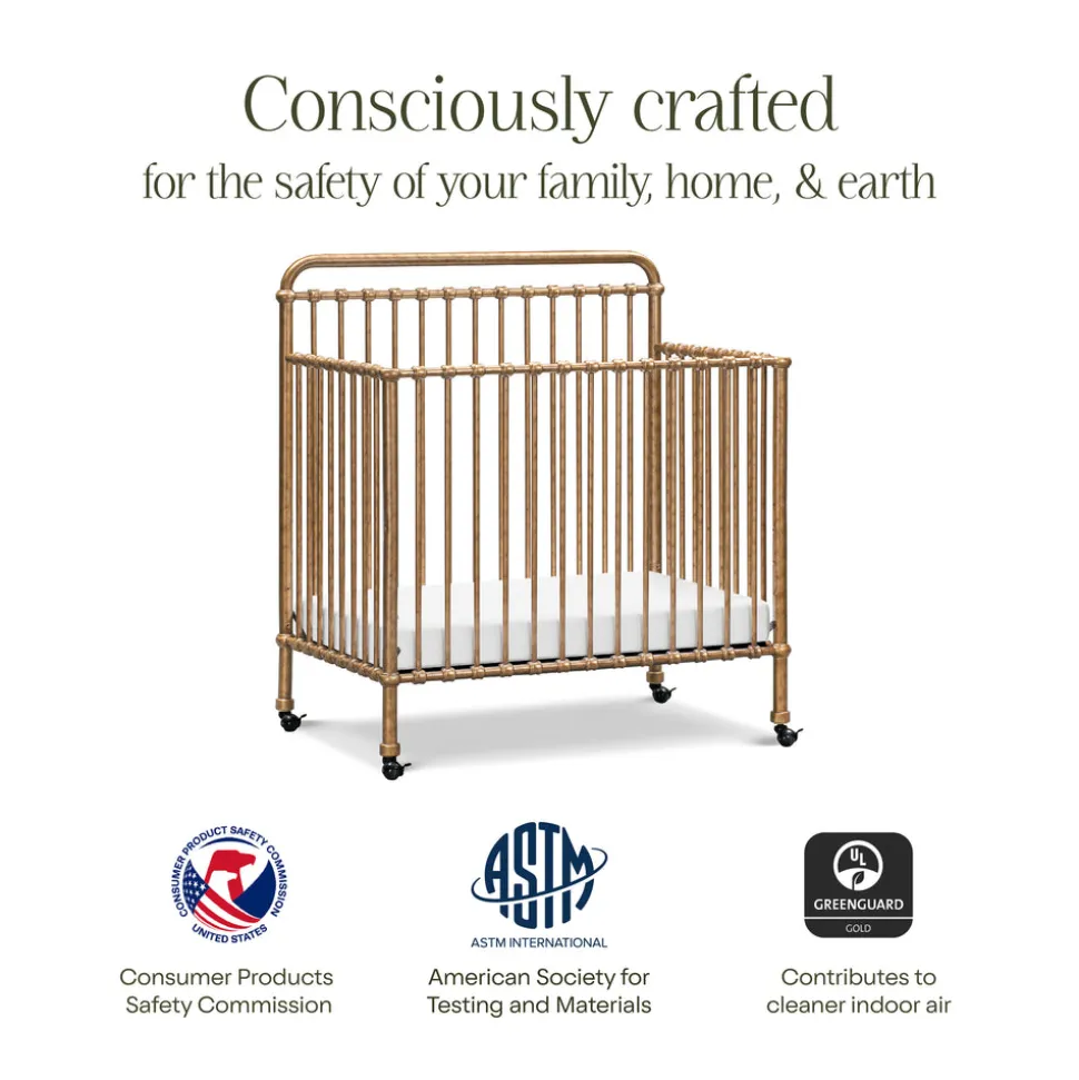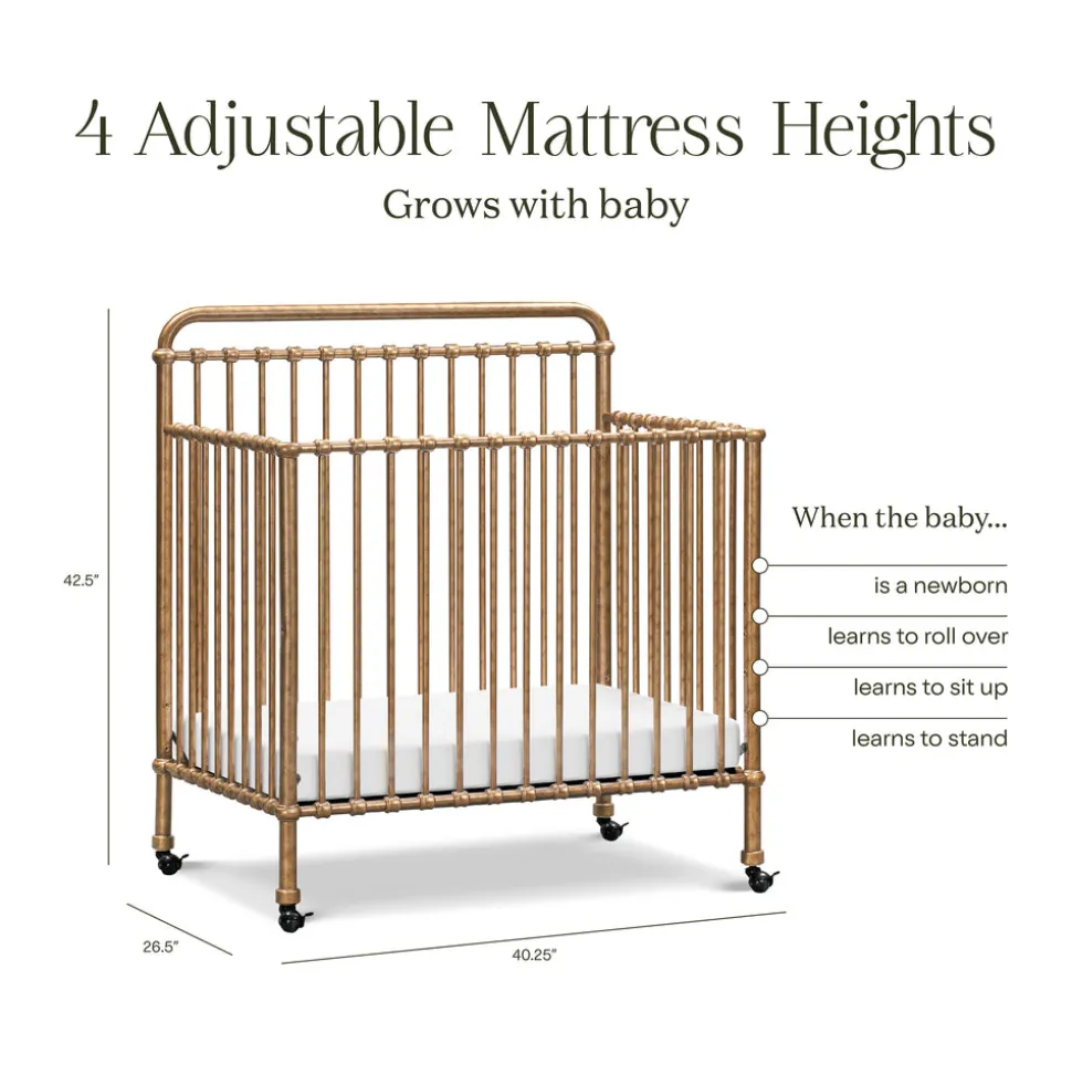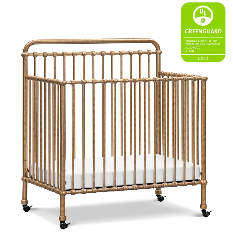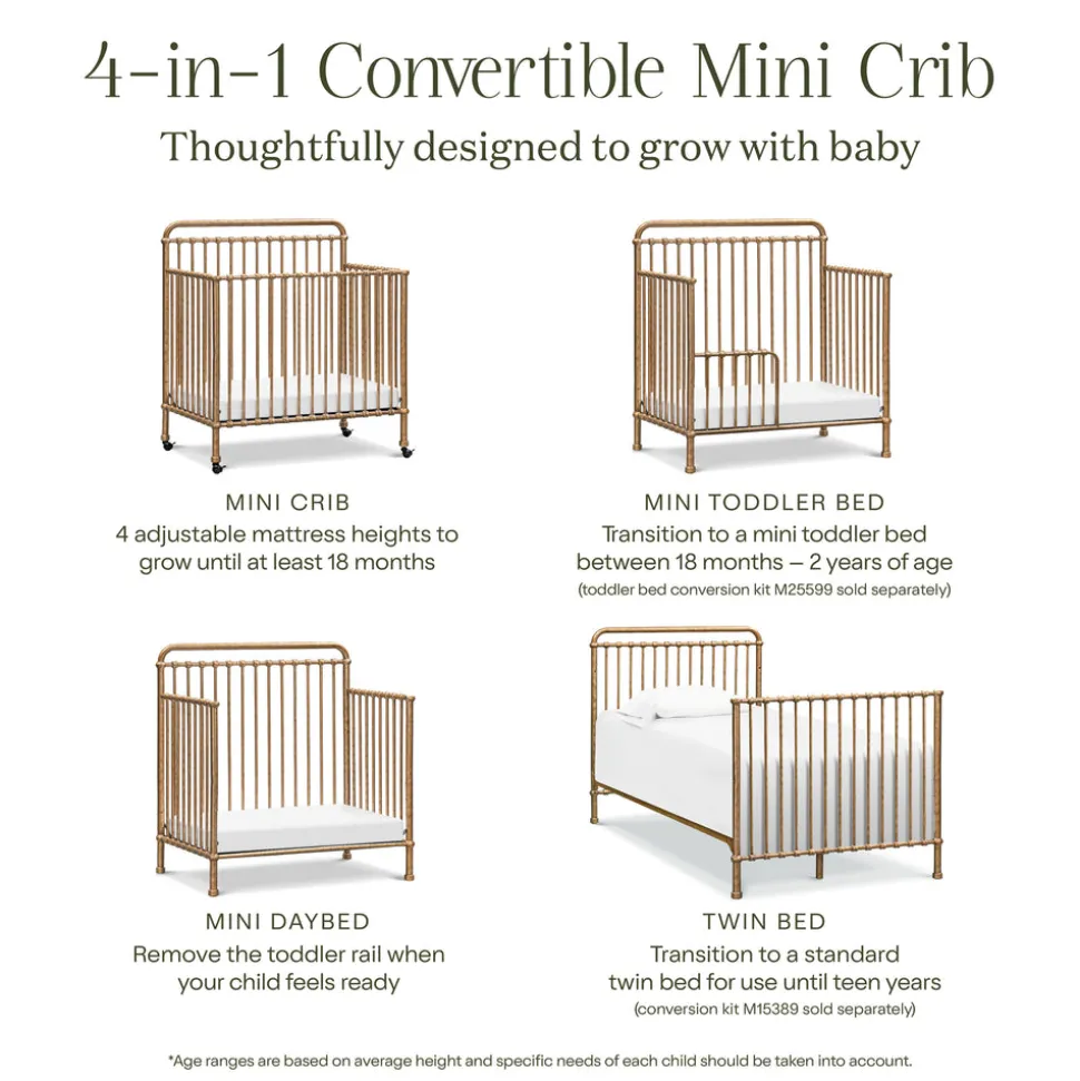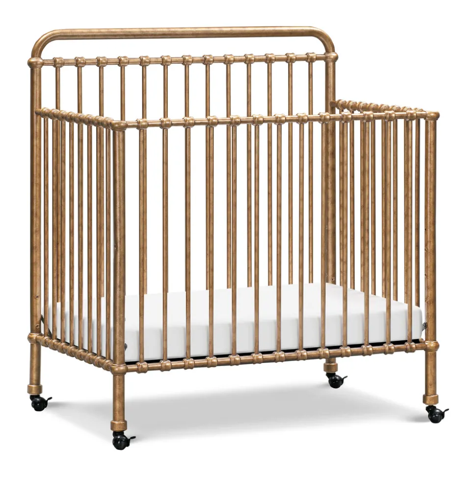 Made to treasure, Namesake brings quiet sophistication to the nursery and beyond. Imbuing heirloom-quality craftsmanship with modern sensibility, these timeless essentials are made to be cherished for years to come. The Winston 4-in-1 Convertible Mini Crib in Vintage Gold reimagines a beloved design for smaller spaces. Crafted from premium steel with vintage-inspired metal castings and a luminous gold finish, this compact crib includes removable casters and transitions from crib to toddler bed, daybed, and twin bed to grow alongside your little one.