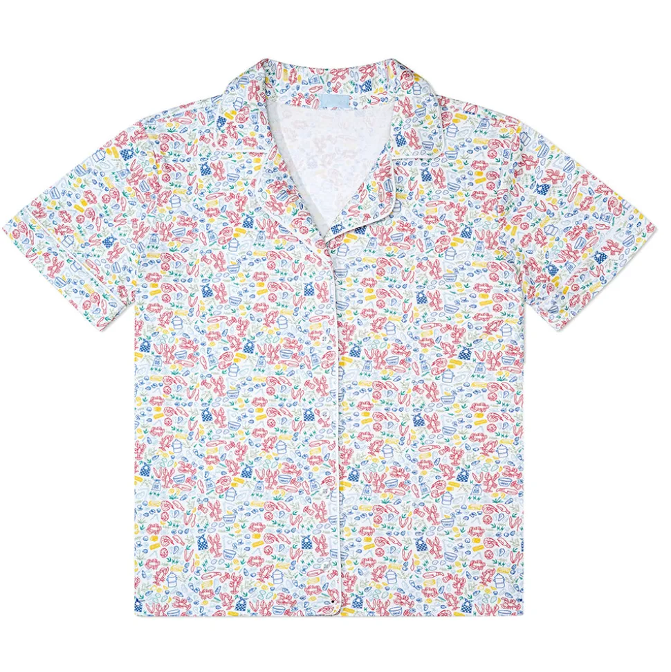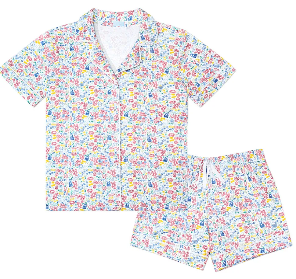 Designed with a mom’s love and made with care, Boston-based Joy Street produces small-batch kids clothes that look classic from afar, but delight in details. Crafted in luxurious 100% Peruvian pima cotton in a female-run factory, every print is hand-drawn by the brand’s founder, a new mom who prizes fit and quality above all else, and isn’t afraid of a little fun. The Women’s Button Front Short Pajama Set in Clam Bake features a charming lobster and shell print. With navy stripe piping, a button front top with collar, and an elastic waistband with drawstring, they deliver style and comfort.