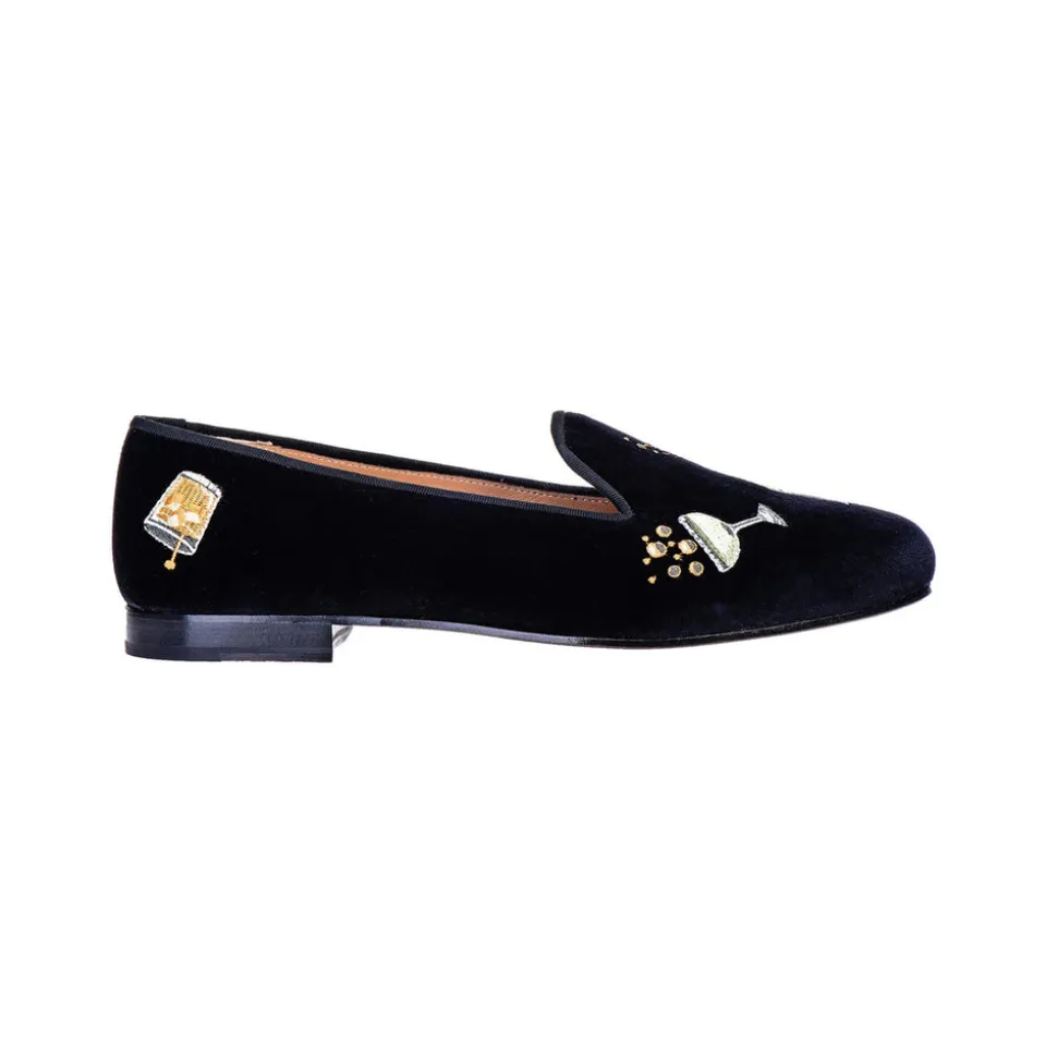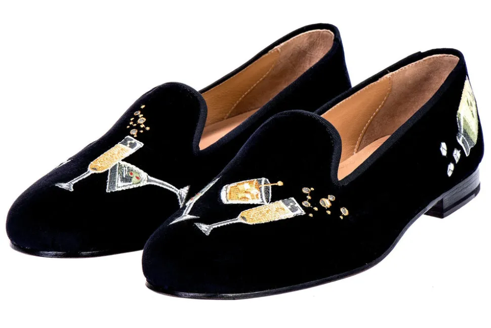 Features an assortment of our favorite celebratory concoctions, embroidered on Black Velvet. Leather-lined and soled to provide additional support and comfort. The stacked wooden heel is 0.75″ in height. Handmade in Spain.
