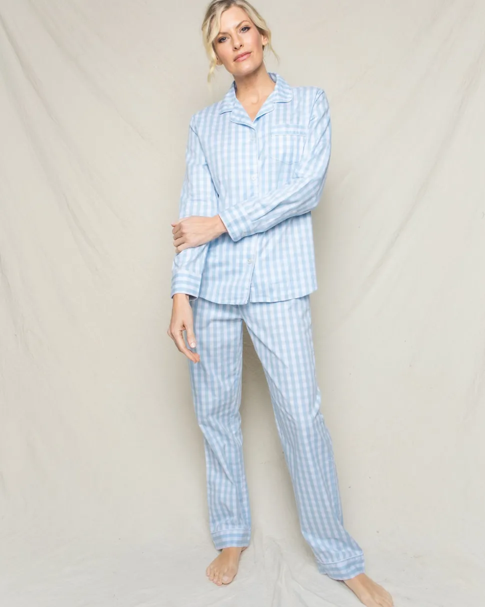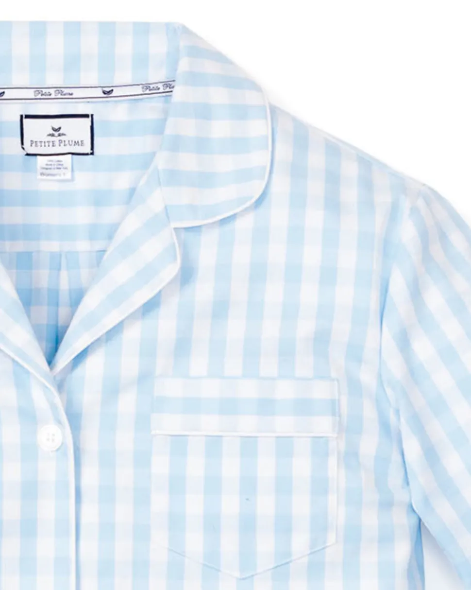 Petite Plume’s luxury sleepwear is a dream come true. Crafted in exquisite cotton, with the finest attention to detail, no chemicals, and classic silhouettes, Petite Plume delivers the utmost comfort and sophistication to every man, woman, and child who wears it. Made in a preshrunk, yarn-died fabric, accented with a timeless gingham, the Women’s Light Blue Gingham Pajama Set is specially brushed so that every wash brings more coziness, and better sleeps. Just dreamy.