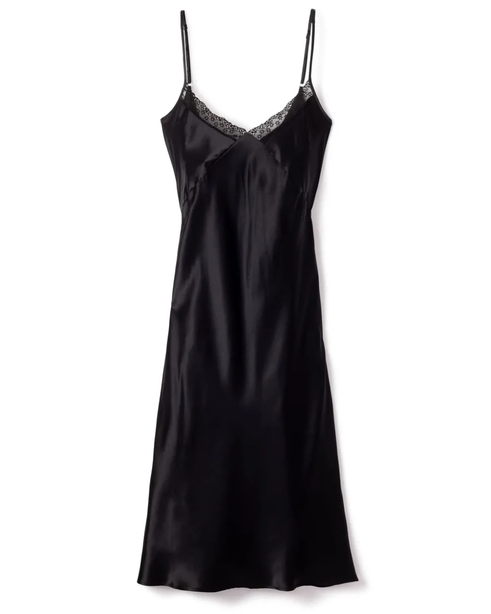 Petite Plume’s luxury sleepwear is a dream come true. Crafted in exquisite cotton with the finest attention to detail, Petite Plume delivers the utmost comfort and sophistication. Featuring delicate spaghetti straps and a sweetheart neckline, the 100% Mulberry Silk Black Cosette Night Dress with Lace is the height of luxe loungewear. With its skimming tea-length silhouette, this dress offers Old Hollywood glamour and ladylike grace for early mornings or bedtime.